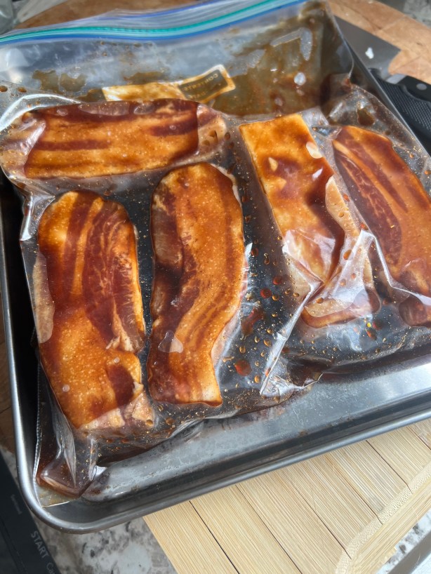 Combine the marinade ingredients in a bowl, mixing well, then add it to the bag with the pork belly. Seal the bag tightly, and squish it around, to make sure the marinade covers all surfaces of the pork.