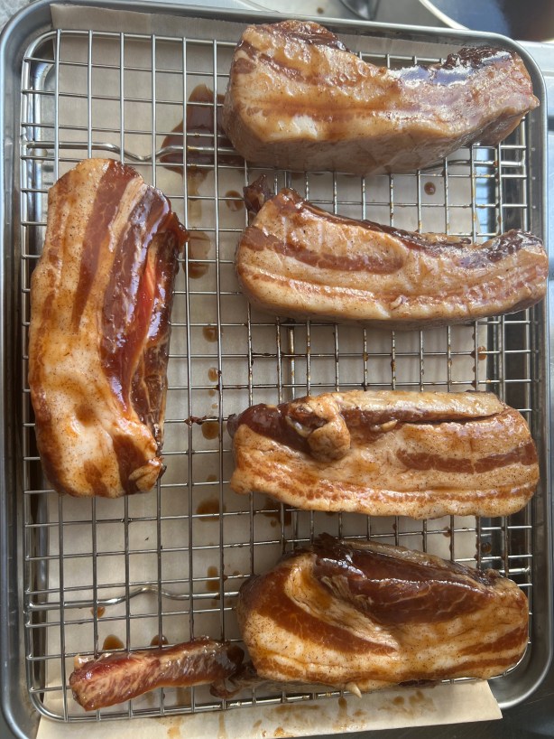 The original recipe calls for pork neck or collar, or pork shoulder…fattier cuts. I chose pieces of heritage Berkshire pork belly that I had already cured, but not smoked.