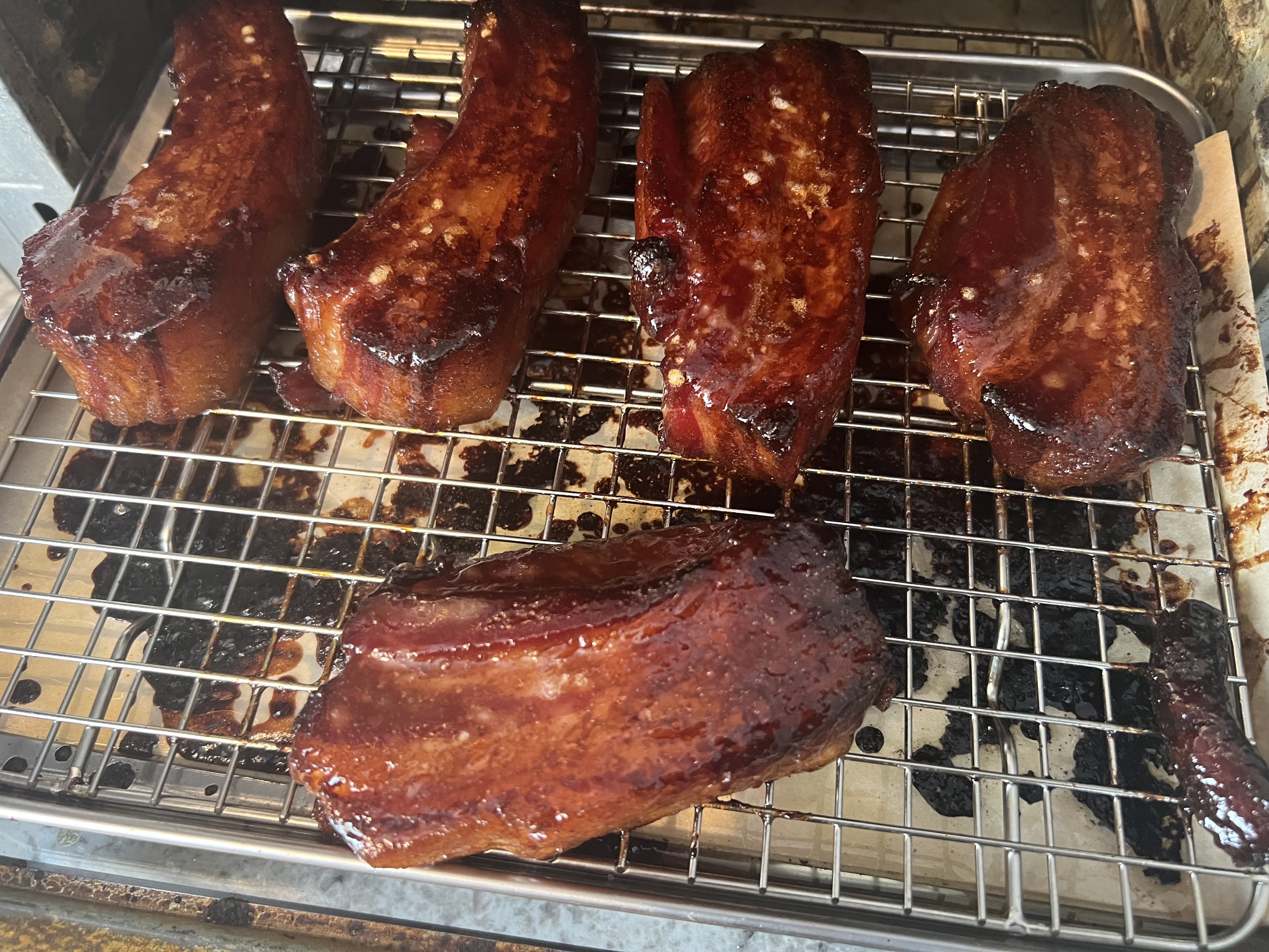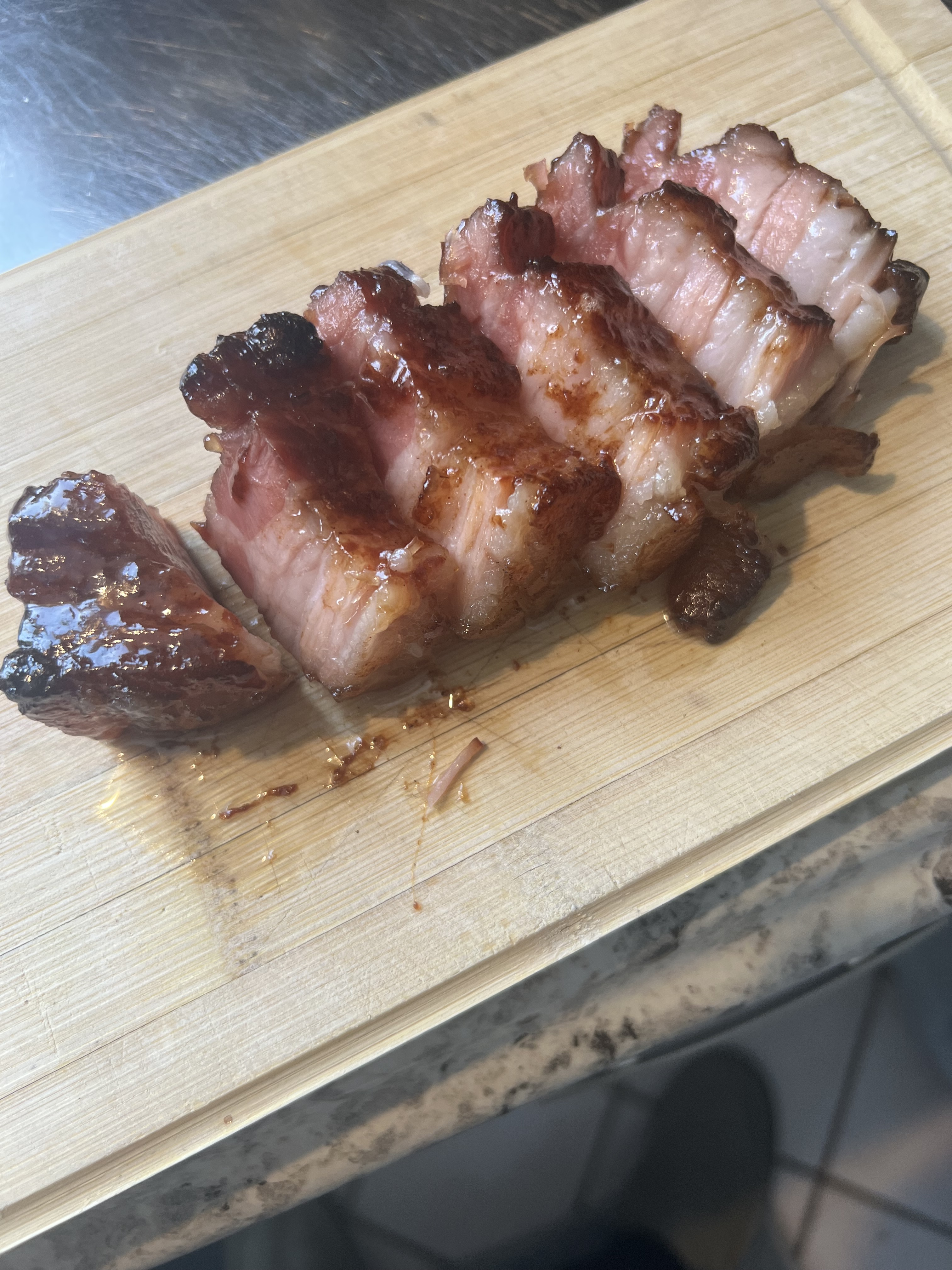 At this point, measure the temperature of the pork. It should be 165°. The meat should be tender, but not falling apart, and it should be caramelized and sticky from the marinade. Let it rest 10 minutes before slicing it.