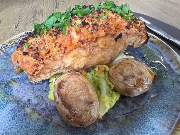 Salt cod with a corn meal and chourico crust