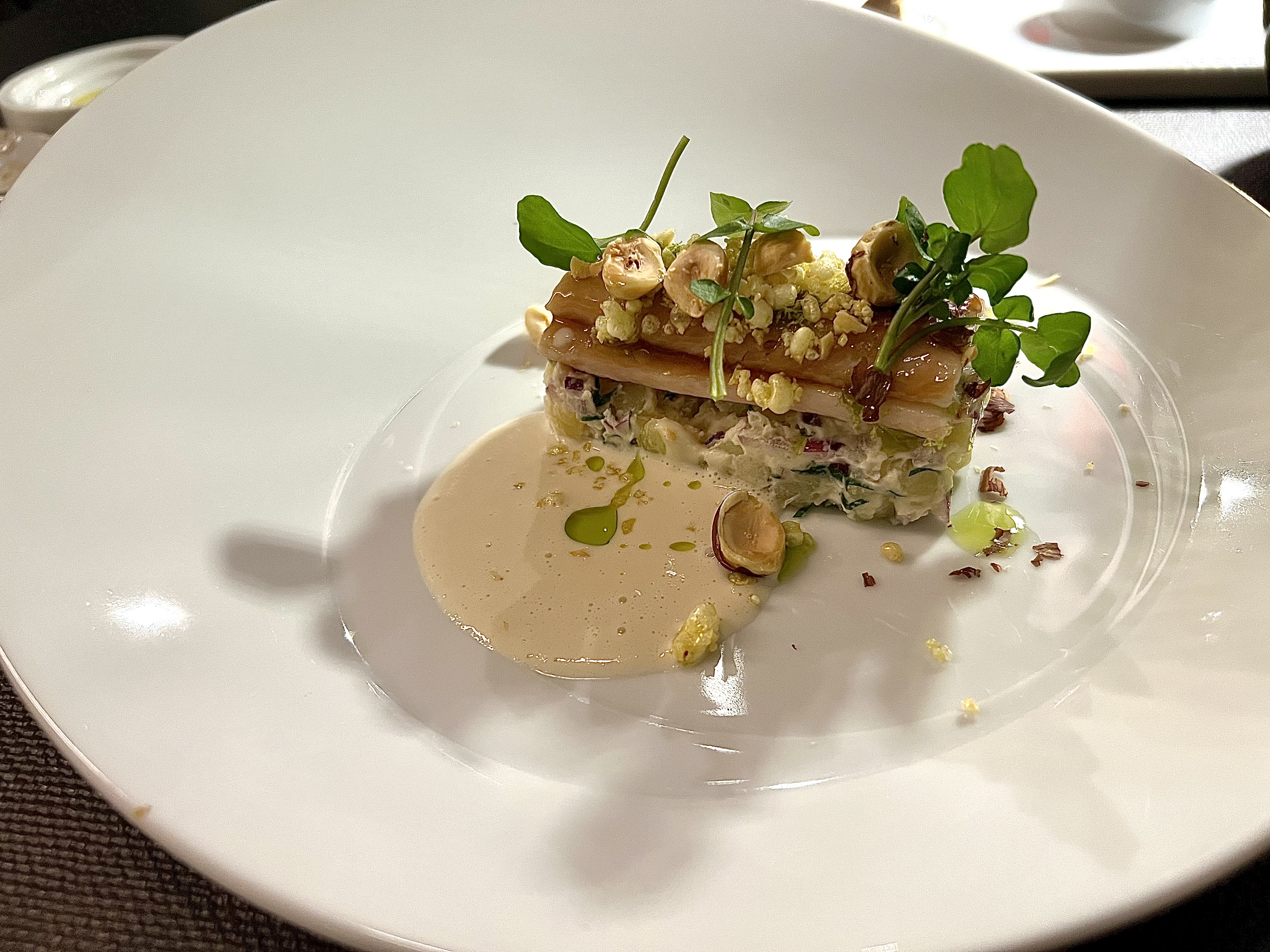 Beef tartare tacoSmoked eel with a hazelnut sauceLambDessert