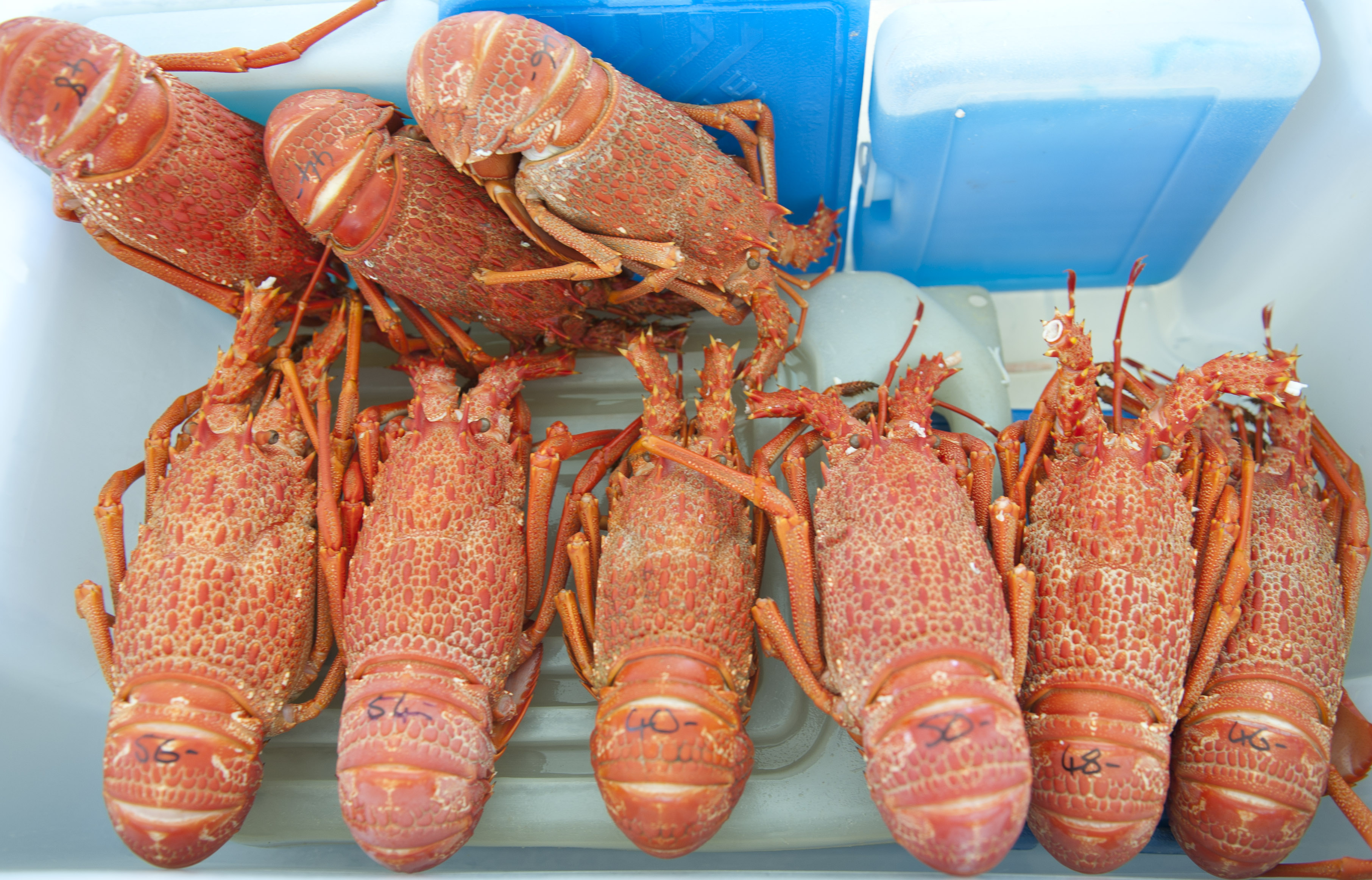 Nins crayfish. The numbers written on each are the prices in NZ Dollars.
