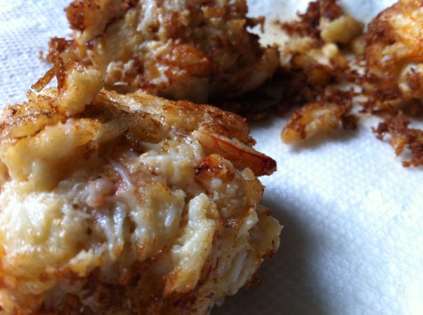Heat oil in a pan to 375 degrees. Gently drop the crab cakes into the oil, and fry for only 10 to 15 seconds. Flip over, and fry 10 to 15 seconds more, just to form a light crust. Don’t over-fry or they will fall apart!