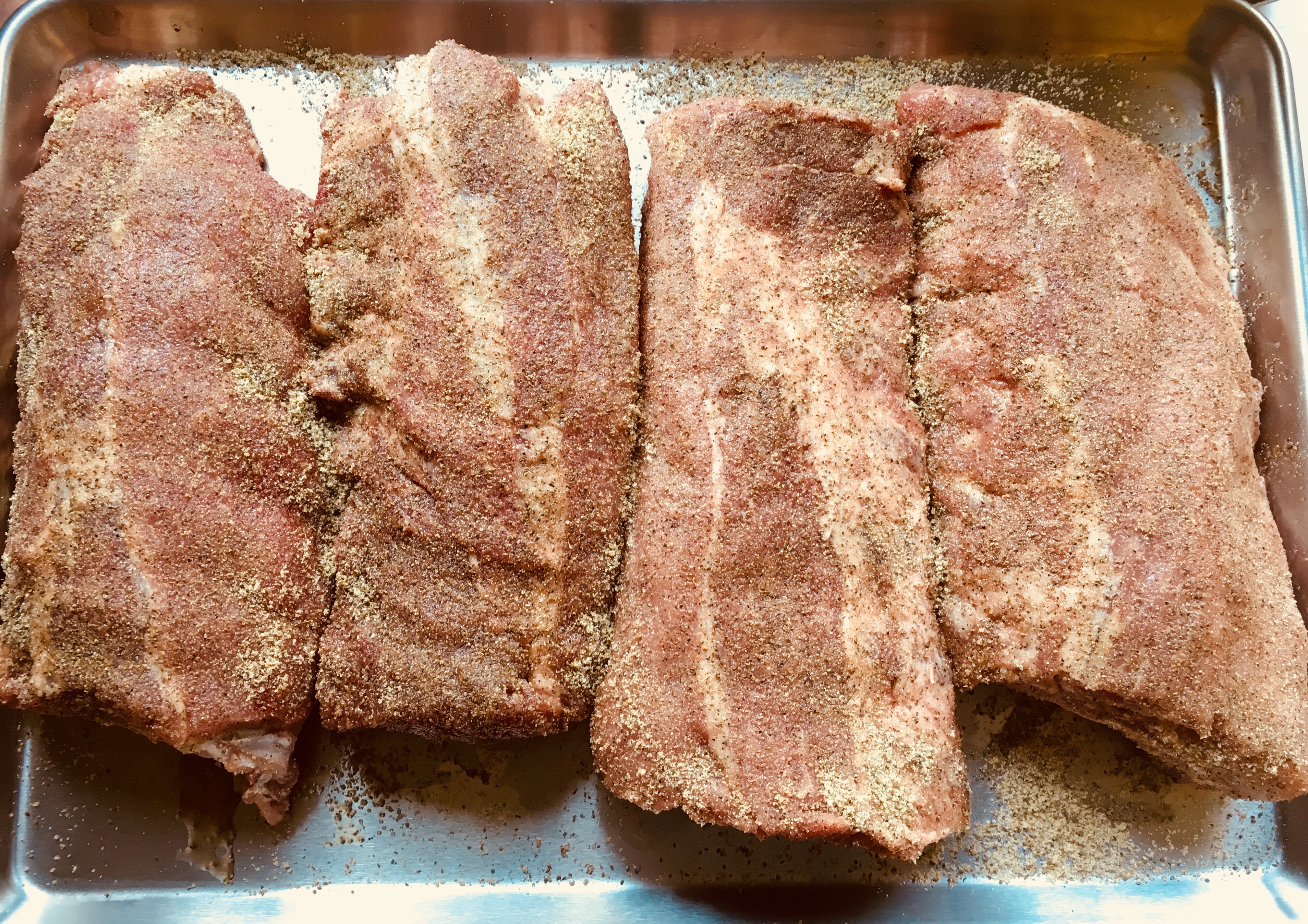 Rub the ribs with the spice rub, and place them in a 250-degree oven or smoker. Place a pan of water underneath to keep them moist and to catch any grease that drips down. I use an electric smoker, so during those 3 hours of cooking, I add hickory chips once an hour.