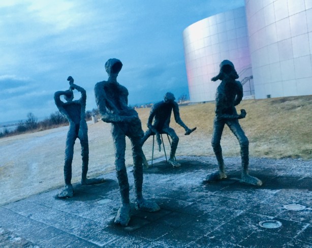 Scultpures outside of Perlan. The dome sits on top of massive, repurposed water tanks. You can see them in the background.