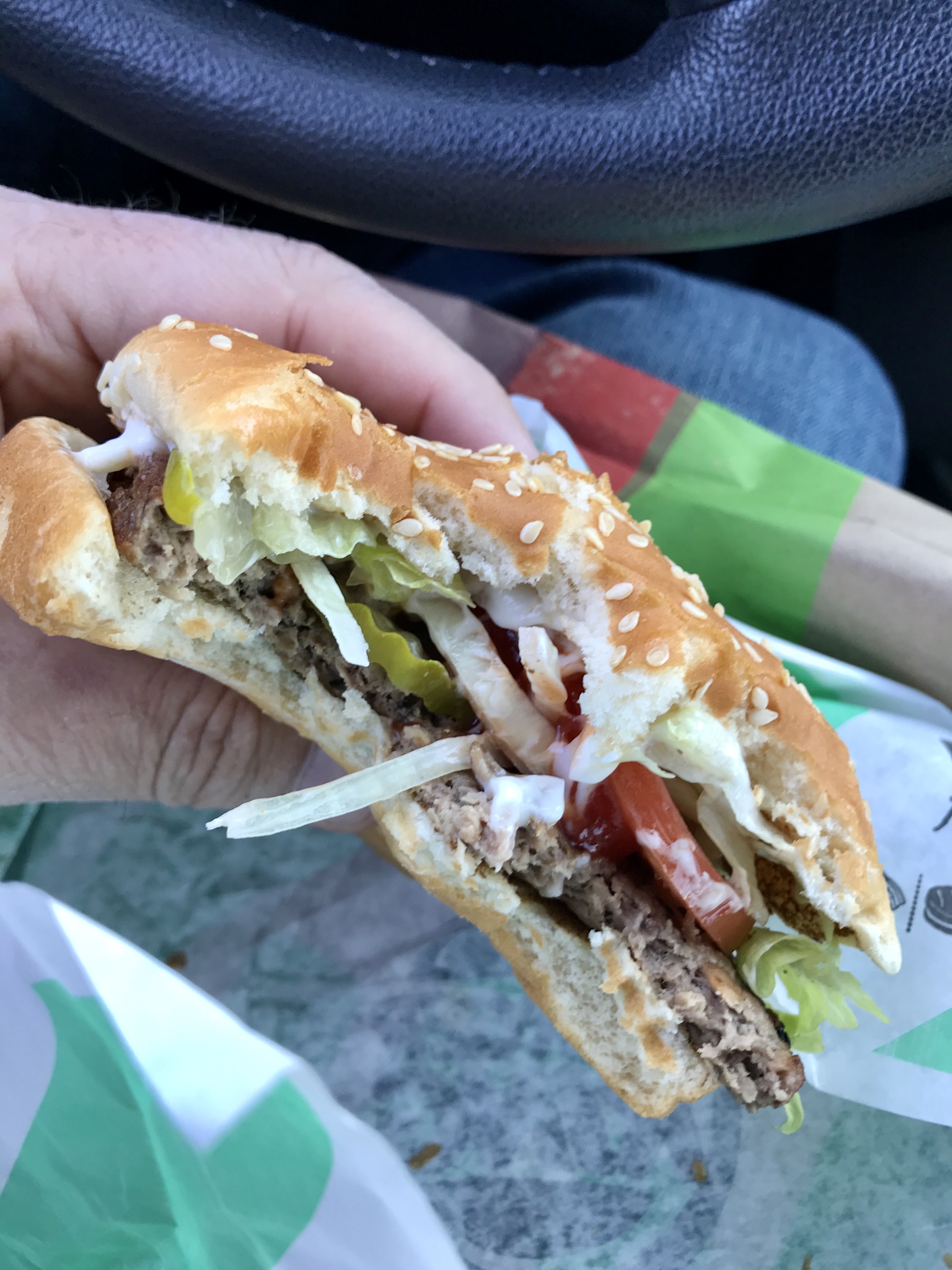 Impossible Whopper: mayo, tomatoes and pickles keep it from being a dry brick.