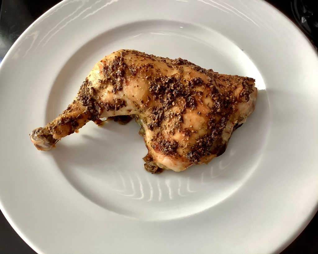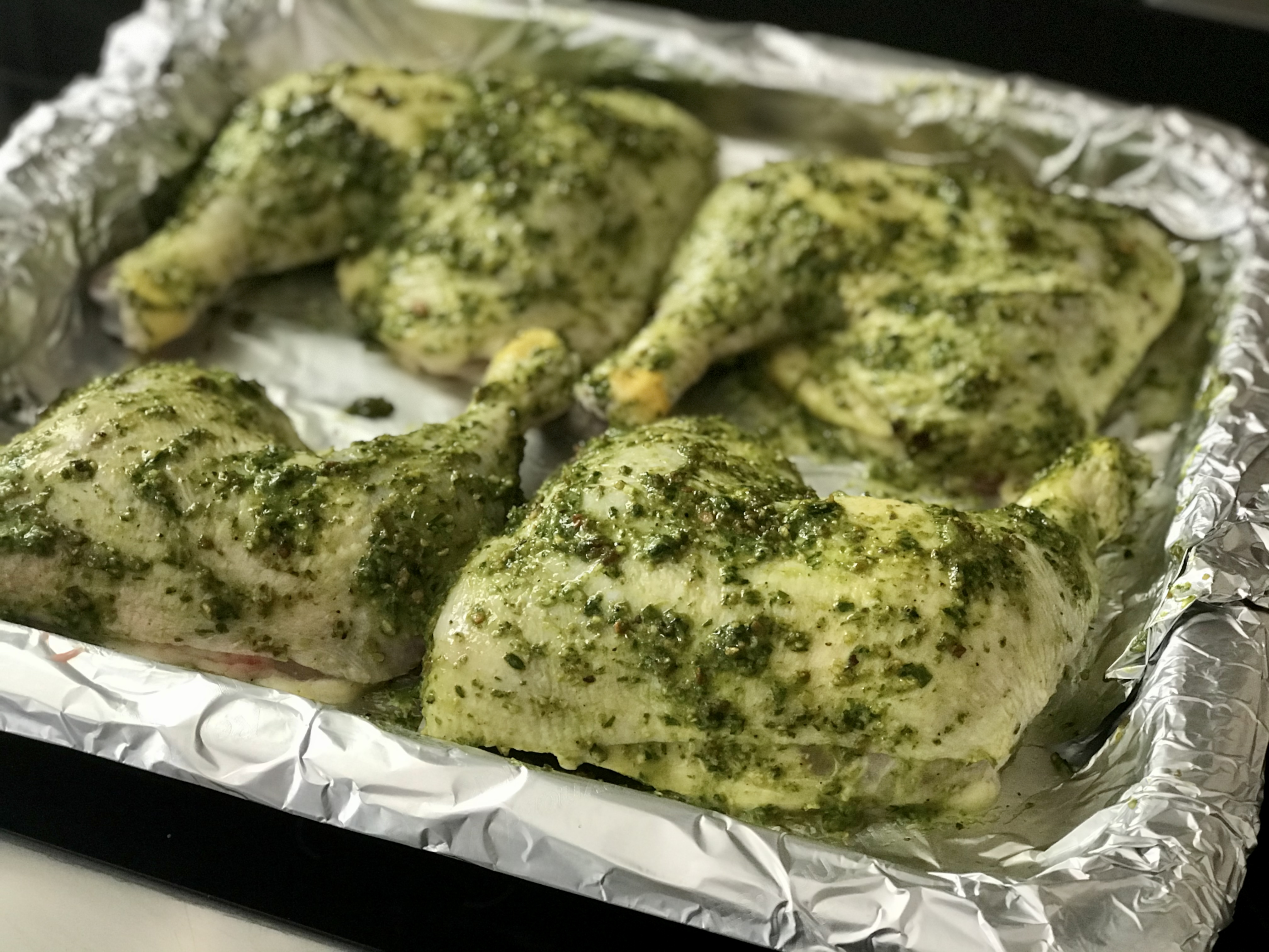 I used chicken leg quarters, and I brushed them on both sides with the pesto, and let them sit for an hour before baking them in a pre-heated 350° oven. They baked for one hour.