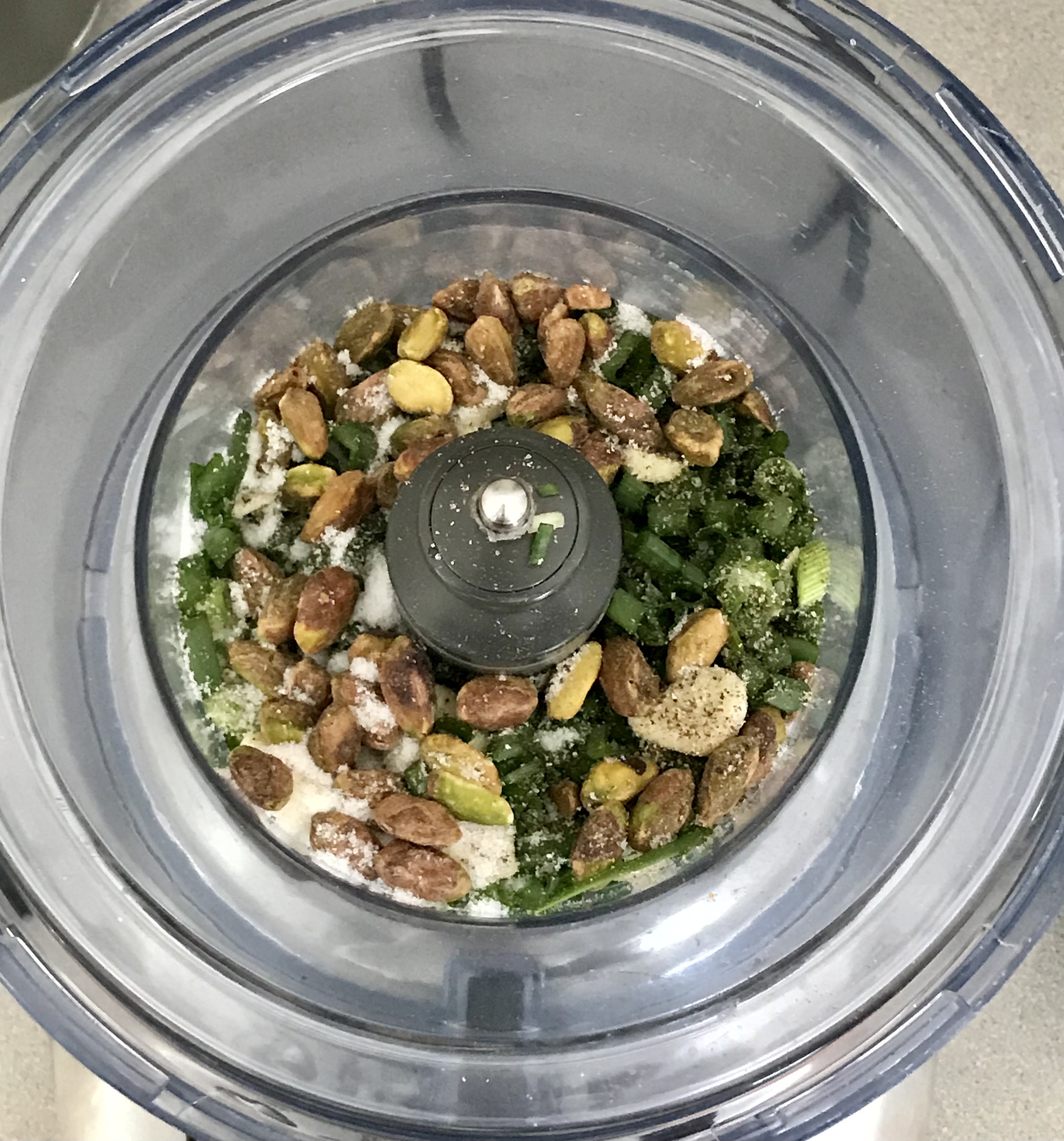 Place the scallions, garlic, pistachios, salt, and pepper in the bowl of a food processor.