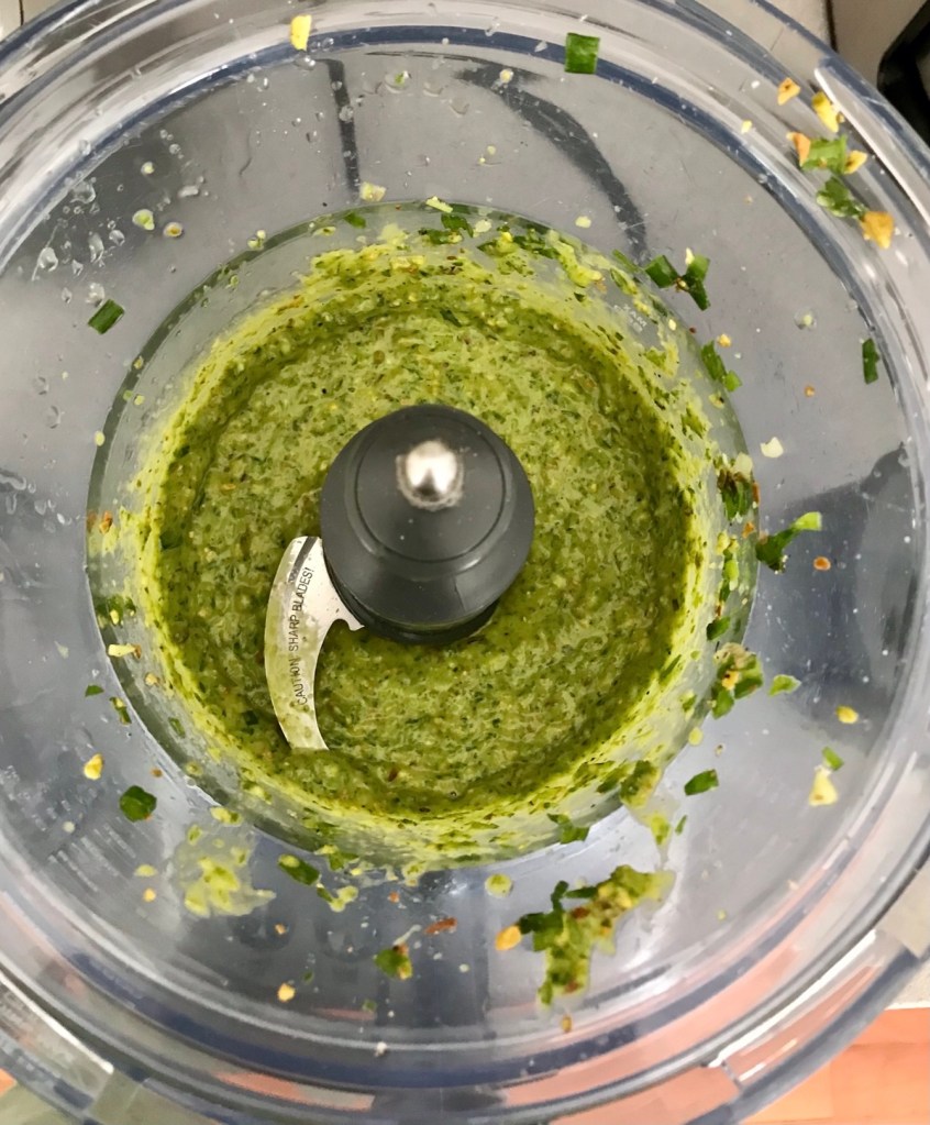 So when my garden had an abundance of scallions, I decided I would make a chimichurri/pesto hybrid using whatever ingredients I had in my cupboard. What I came up with was absolutely delicious as both a marinade and side dressing. This time, I tried it on chicken.