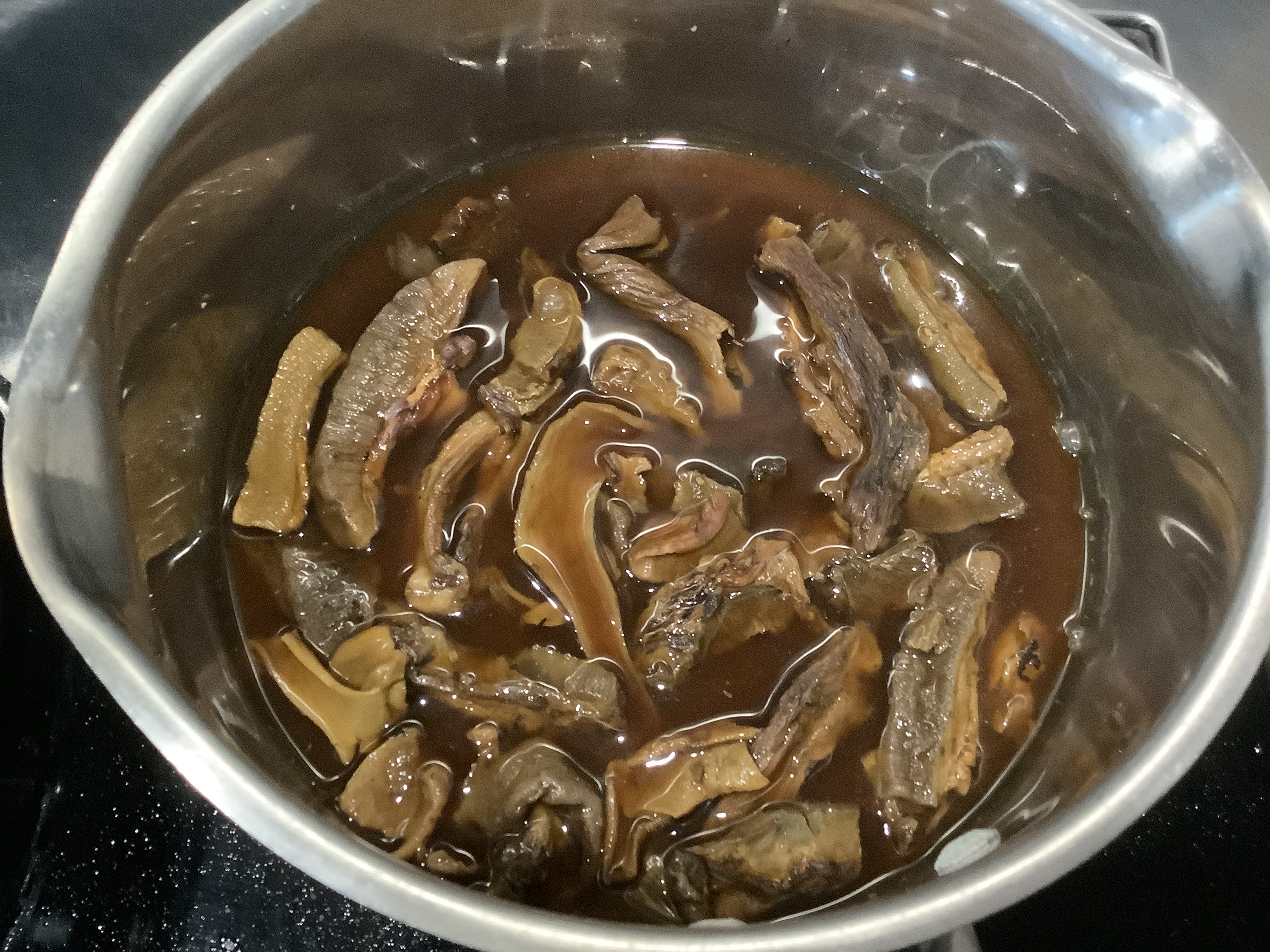 Place the dried porcini in a sauce pan with about 1 1/2 cups of water. Set it on high heat and let it boil until the liquid has reduced to about 1/2 a cup. Set it aside. When it has cooled a bit, strain off the liquid into a glass and chop up the mushrooms on a cutting board.