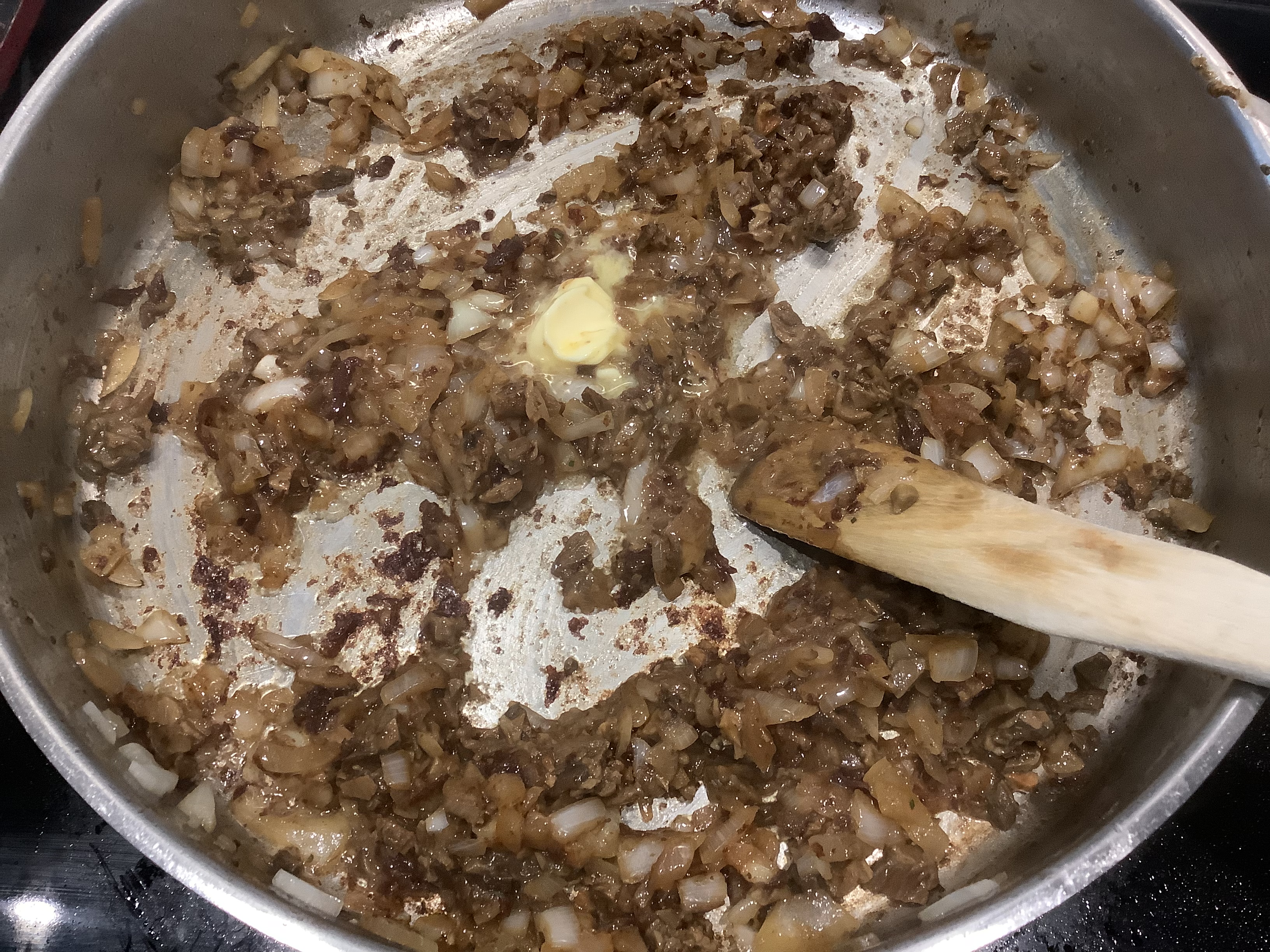Once the beef is done, in the same pan, toss in the chopped onions with a little more of the butter and sauté until they’re translucent. You can add some of the mushroom liquid to the pan now, to deglaze it and remove some of the yummy bits stuck to the bottom.