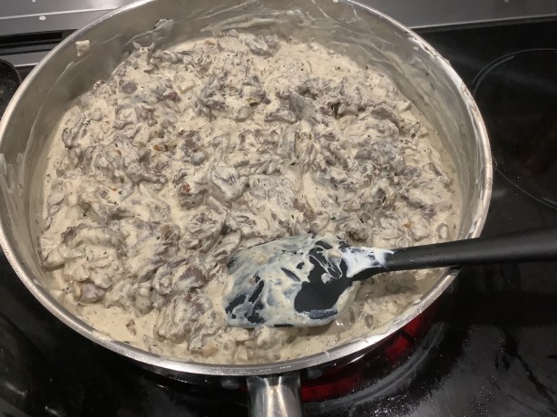 When the pasta is almost done, return the pan with the mushroom mixture to medium heat, and add the sour cream to it, mixing well. Add the beef and any juices that are in the bowl with it, mixing well.