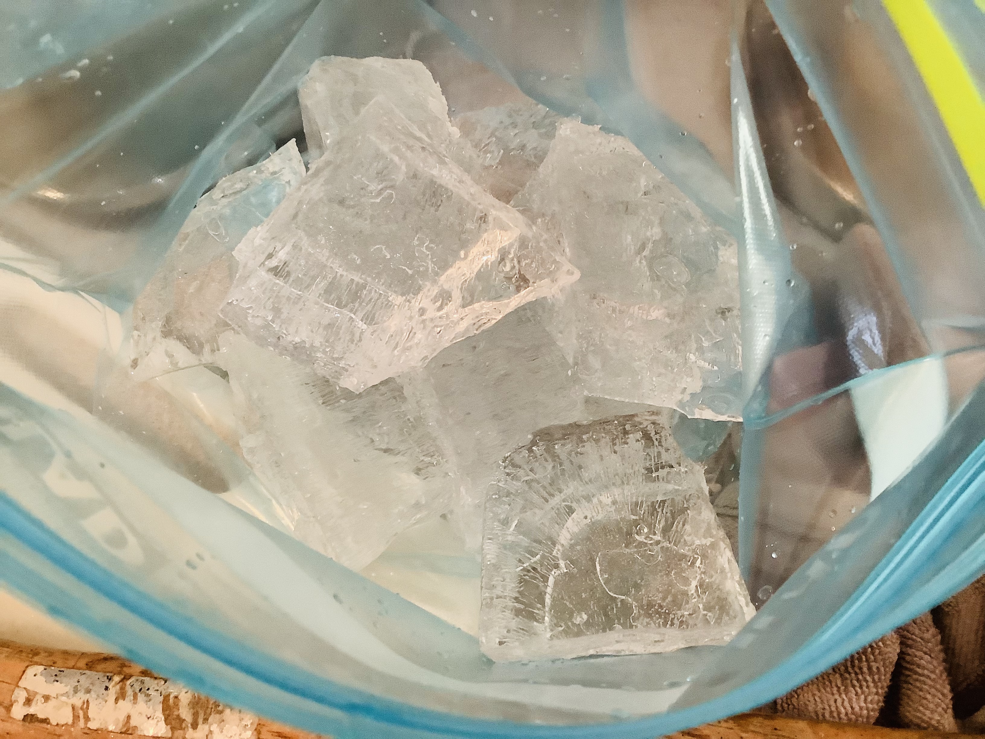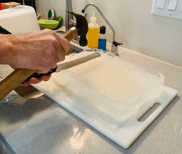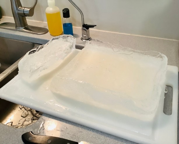 Gravity will start doing the work as the ice slowly slips out of the cooler and lands on the cutting board with a loud clunk!