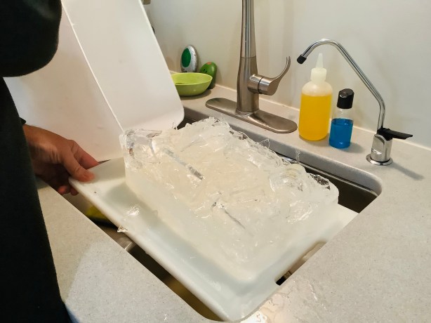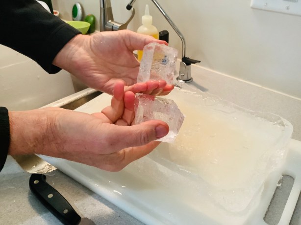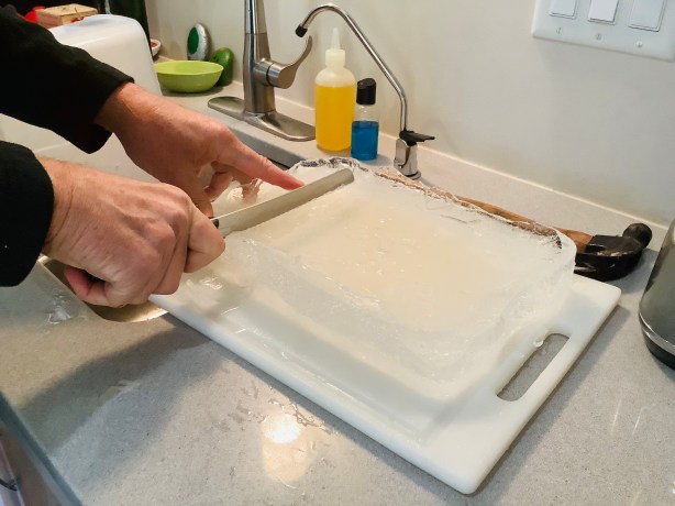 You now have a rectangular piece of ice that’s about an inch-and-a-half to 2 inches thick. Wipe off the shards of ice on the top of it, and using the serrated knife, carefully start sawing the ice gently to make a line. It doesn’t have to be deep.