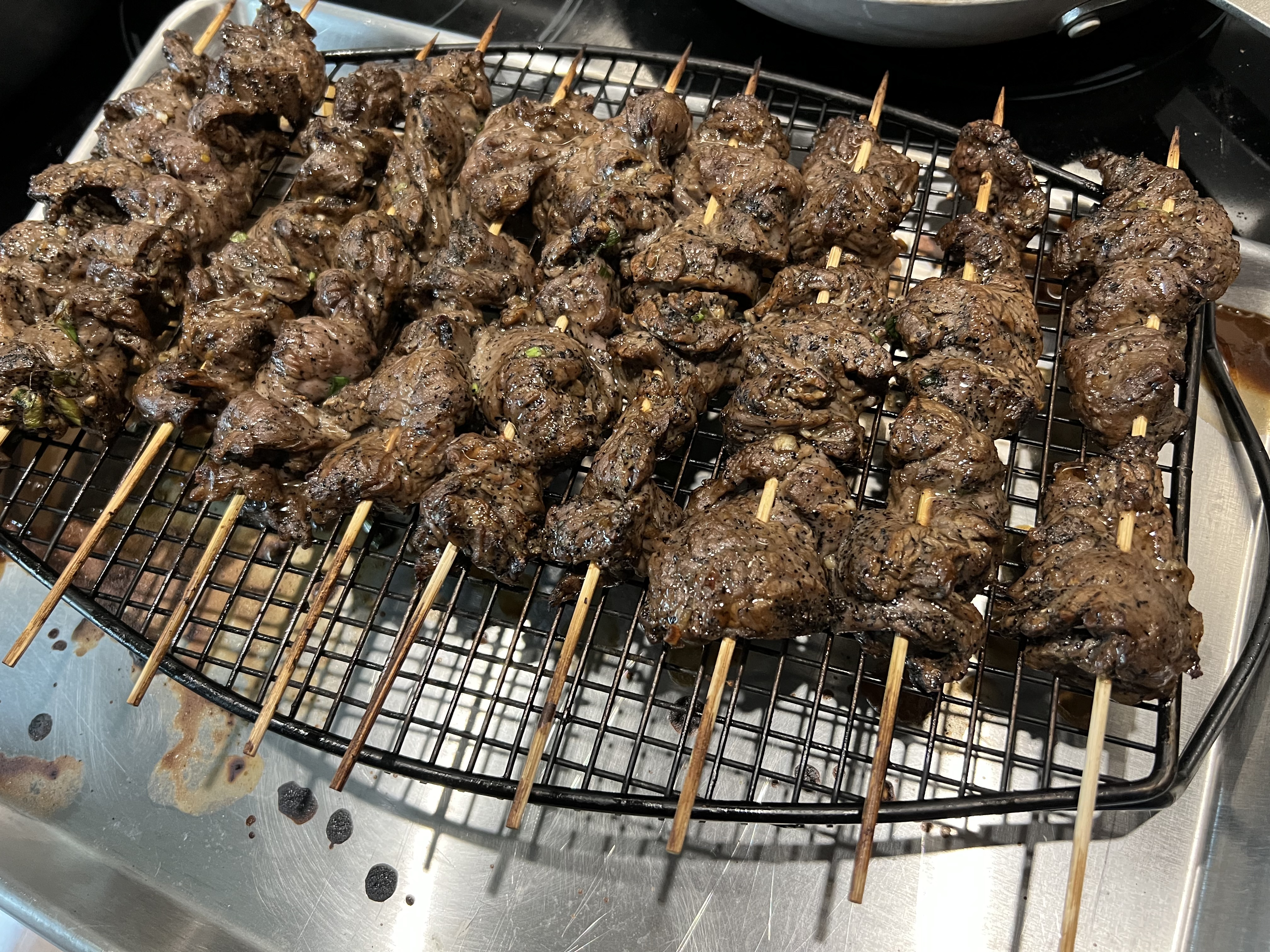 If you’ve got a convection oven (an “air fryer” for you youngsters), pre-heat the oven to 350. Place the skewers on a grate that is raised an inch or so above a sheet pan, so that the warm air in the oven can circulate all around the meat.