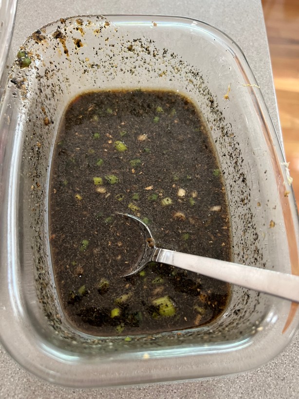 Place the crushed sesame seeds in a bowl with all the other marinade ingredients, mixing well.