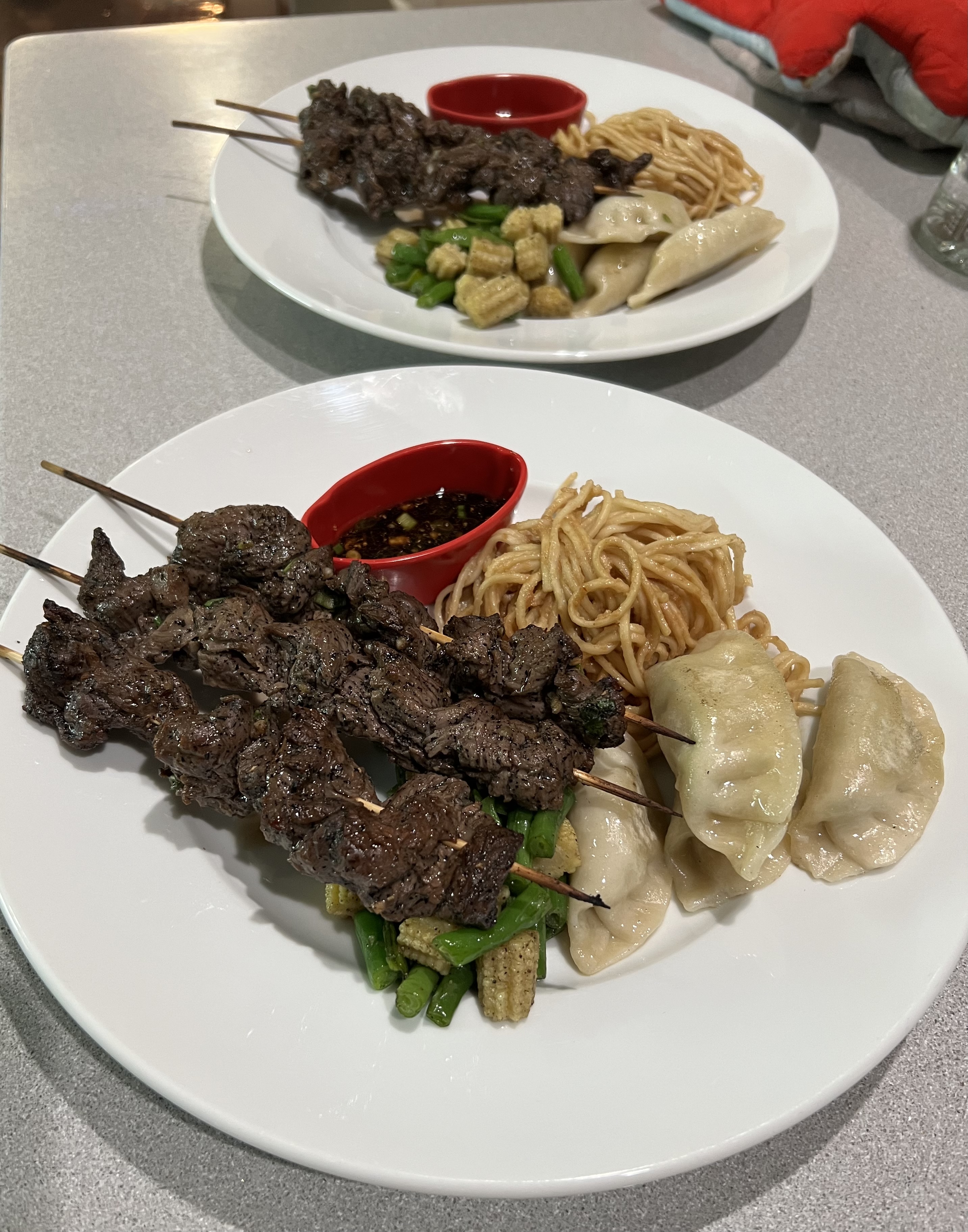 Enjoy your beef skewers with whatever you like! I served mine with stir-fried vegetables, lo mein with a peanut-chili sauce, and dumplings with a homemade dipping sauce.