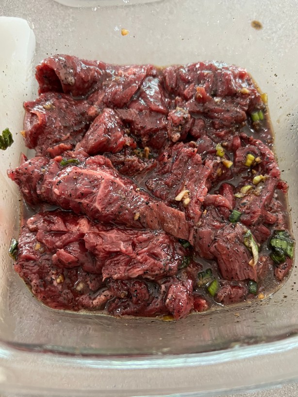 Slice the beef on the bias into thin strips about 4″ long. Place all the beef in the bowl with the marinade, and squish it around to make sure all the meat makes contact with the marinade.