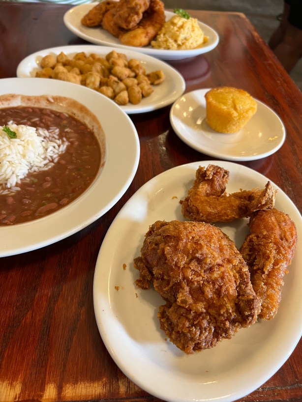 Fried chicken, fried okra, red beans and rice, and cornbread. We had dinner at Antoine‘s, the oldest restaurant in New Orleans. They are famous for inventing Oysters Rockefeller, which, I have to say, was a bit disappointing. There’s a lot of history here, but it doesn’t make up for some of the lack of service or quality of the food. Excellent filet mignon, however.