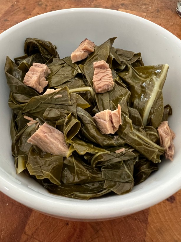 Normally when cooking collard greens, you throw in a chunk of salted pork of some kind. But I didn’t have anything like that. I did, however, have a nice slab of beef brisket in my freezer from a previous smoking and grilling session. So I tossed that into the pot.