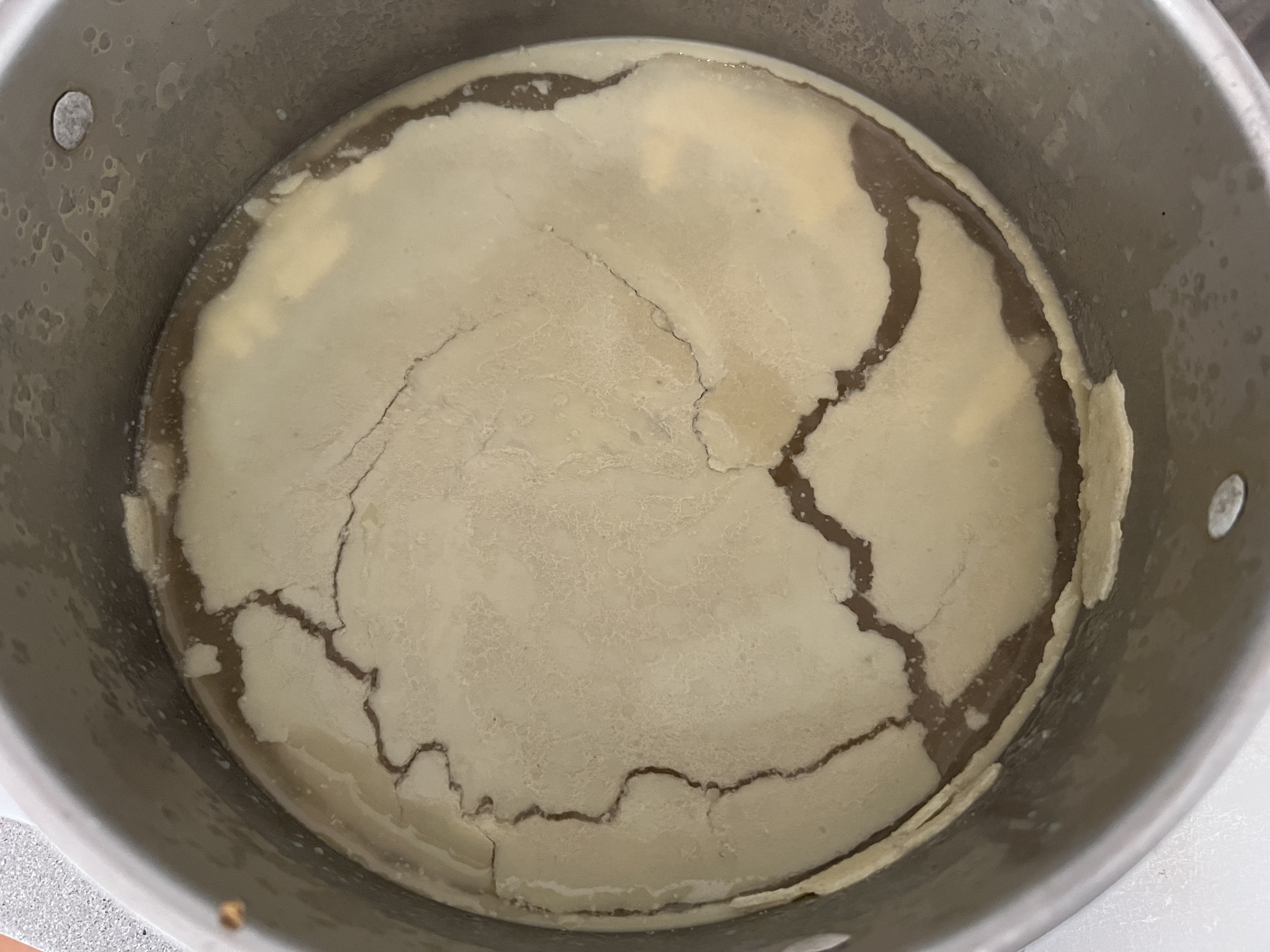 The next day, I could easily scrape away most of the fat that was in the stock. Once I did that, I put the pot back on the stove and brought it to a boil. Meanwhile, I removed the brisket from the fridge and I chopped it up into small pieces, discarding the real fatty pieces that already served their purpose in flavoring the stock earlier.