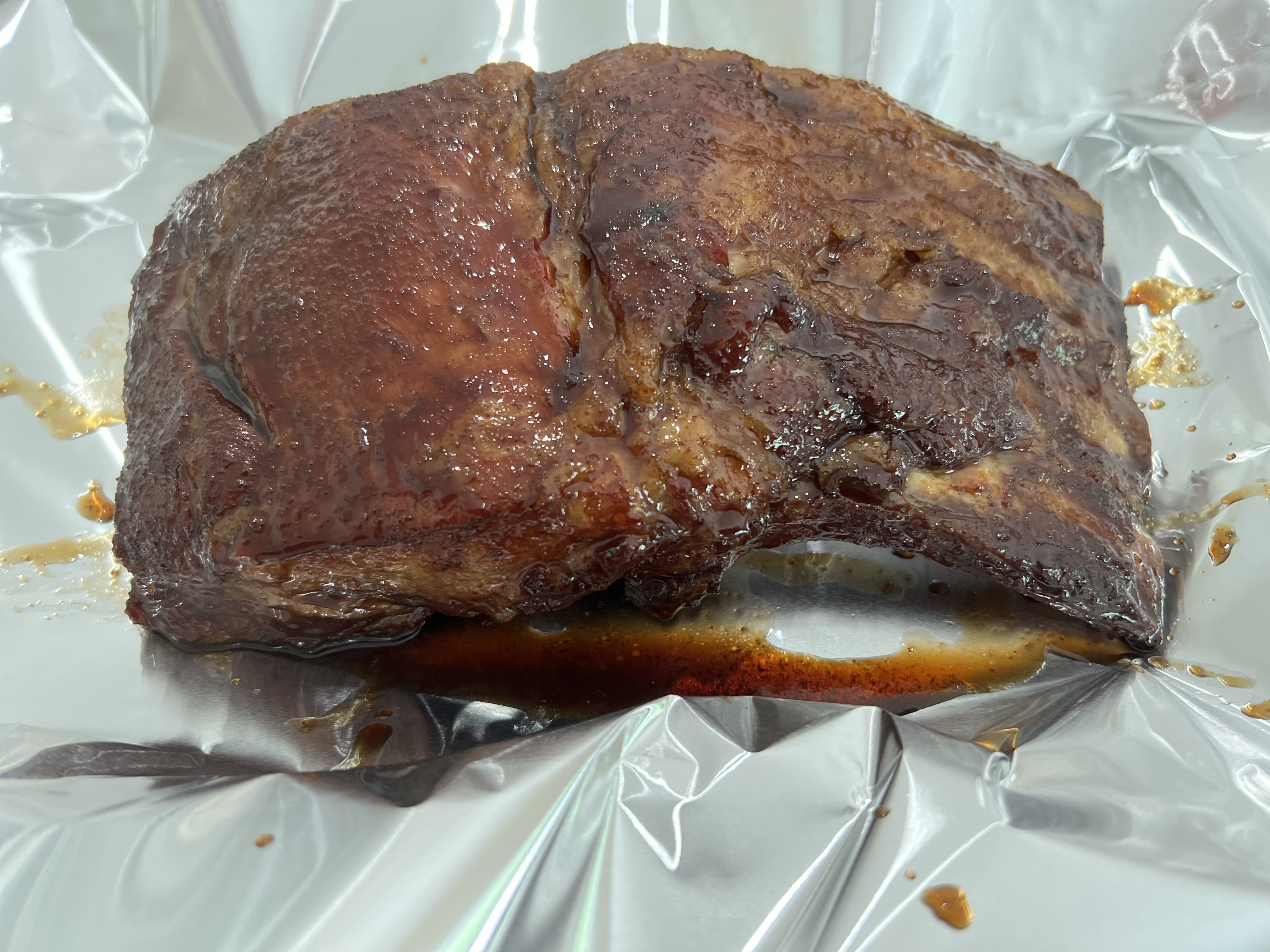 I removed the ribs from the smoker and placed them on a tray covered in foil. I brushed my sauce/glaze all over the ribs and then wrapped the foil tightly around them, placing them in my kitchen oven and cooking for another hour at 250°.