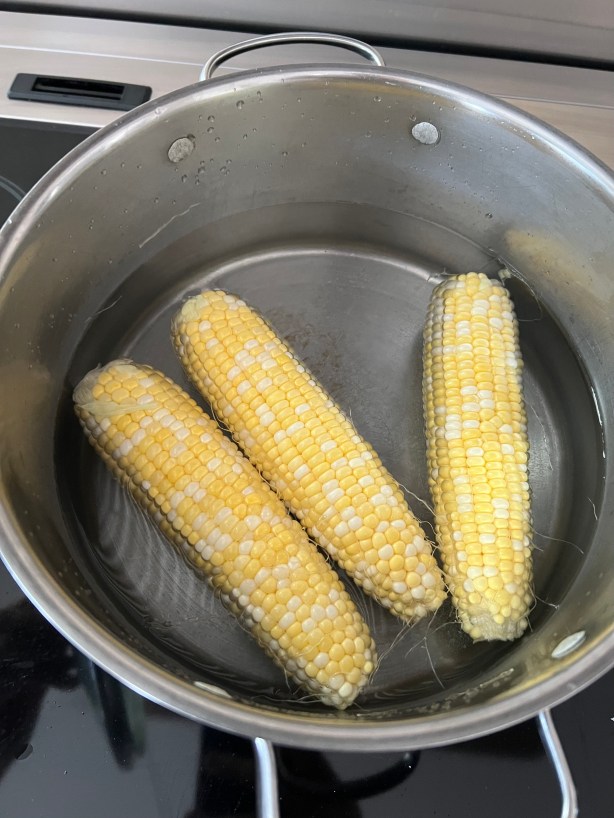 I took the shucked ears of corn, placed them in a pot of cold water, and brought it to a boil. I boiled the corn for just 2 minutes, removing them from the water at that point.