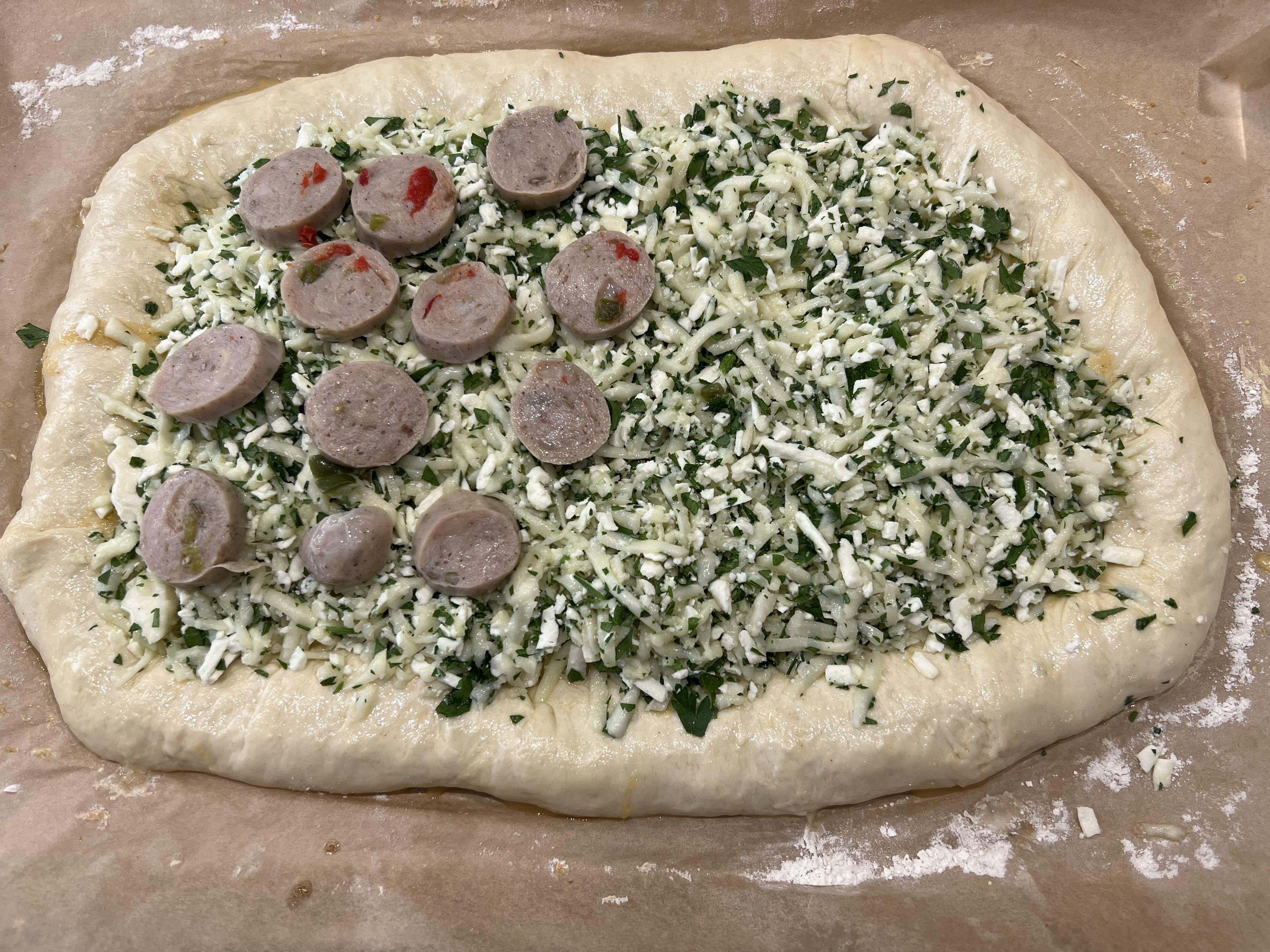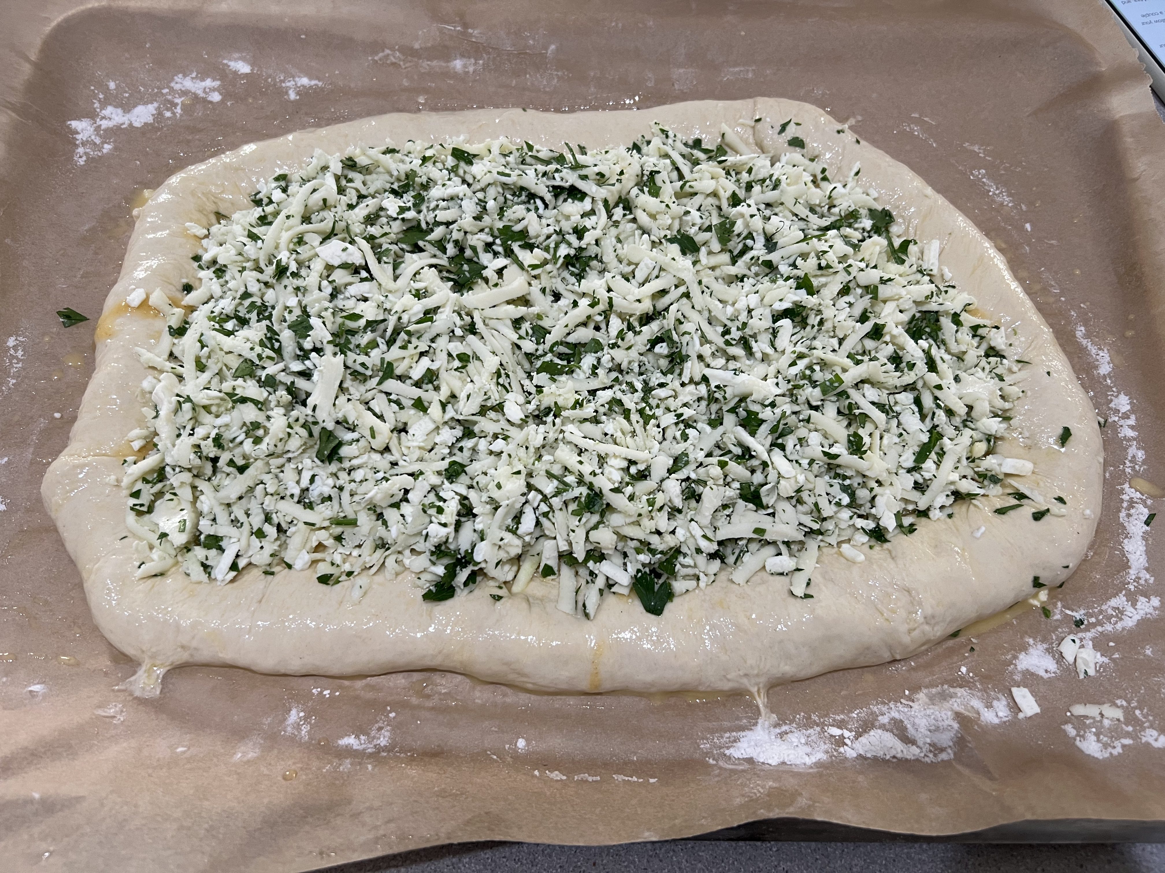 While the dough is rising, make the cheese mixture, combining the mozzarella, feta and parsley in a bowl. Set it aside in the fridge.