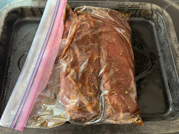 Place the lamb in a plastic bag and pour the marinade in, squishing it around to make sure it makes contact with the meat. Place it in a pan or a bowl to prevent accidental leaking.