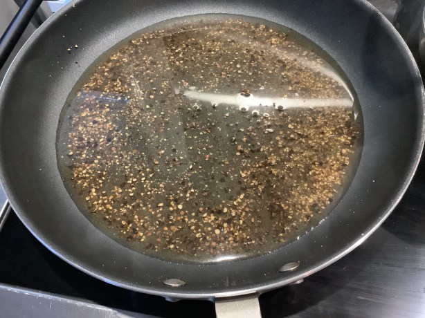 Add a ladle of the pasta water to the pan with the peppercorns.