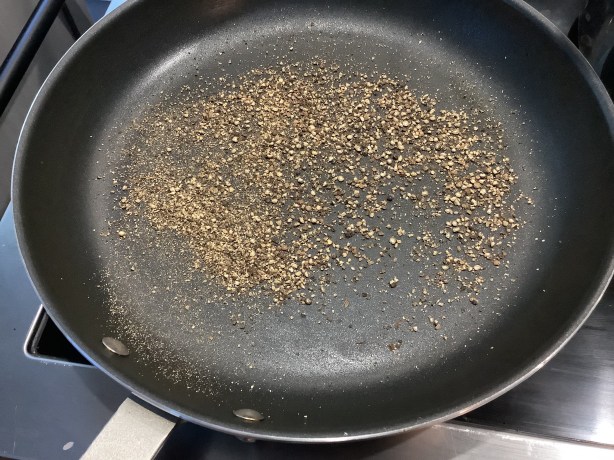 While the pasta is cooking, heat a dry pan and dry fry the roughly ground peppercorns until they start to release their aroma.