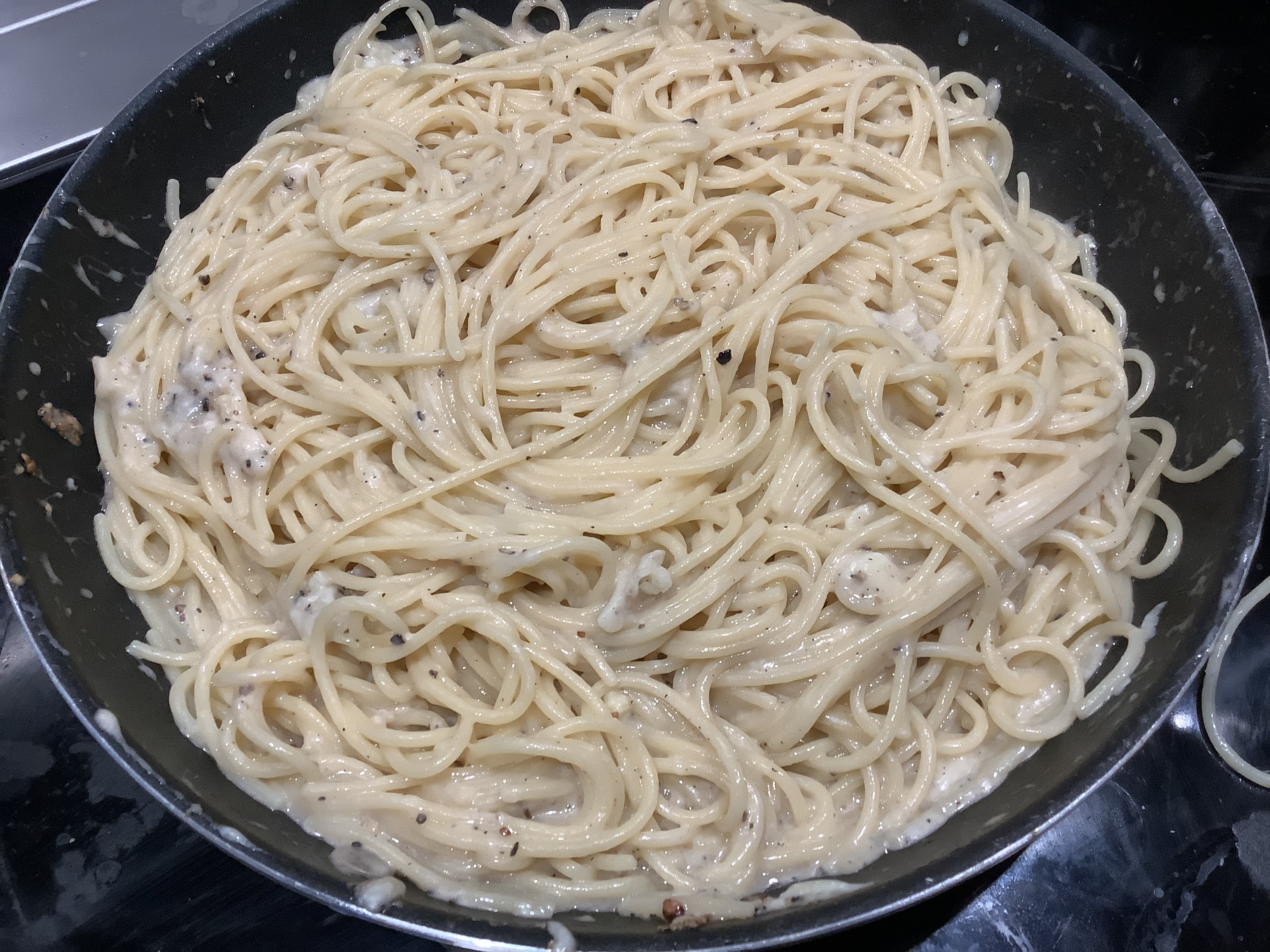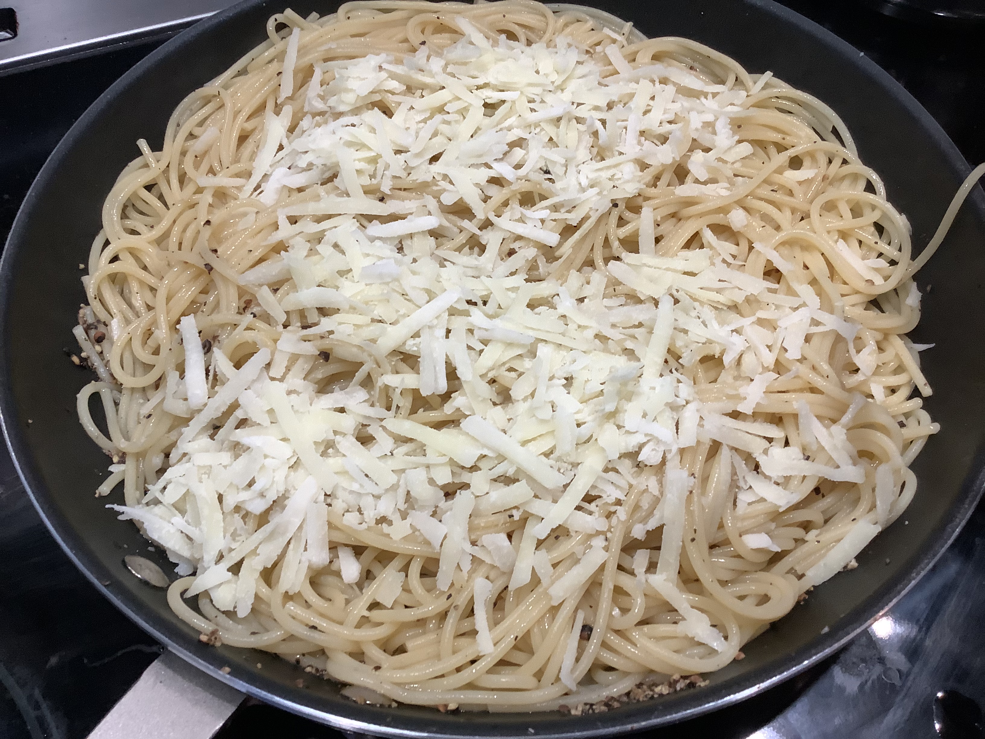 When the pasta is ready, move it to the pan with the peppercorns, saving the pasta water.