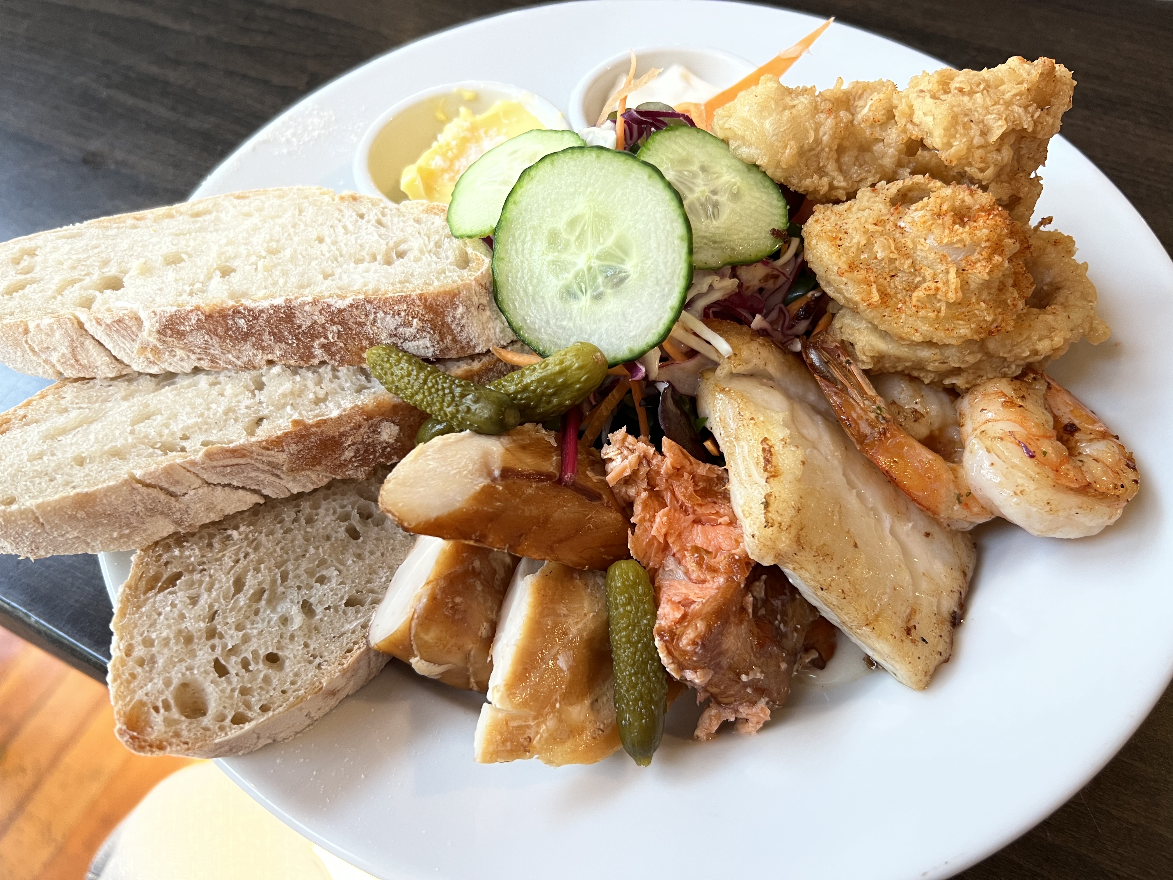 Fish plate…2 kinds of smoked fish: salmon and warehou. Grilled tarakihi. Garlic prawns. Crispy calamari. Cornichons, caper mayo, salad and ciabatta bread. I will have this again!
