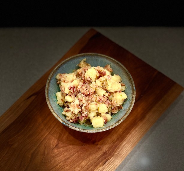 Now add the drained potatoes to the pan, mixing well, coating the potato pieces in the bacon fat.