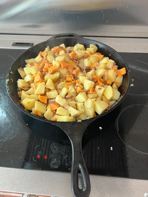 Place the cut potatoes in a pot of clean, cold water over high heat on the stove. (If using sweet potatoes, boil them in a separate pot. See below.) Add a little Kosher salt to the water. Let the potatoes cook until they are a bit al dente…a bit underdone. They will cook some more later in the pan. Drain them and set the potatoes aside.