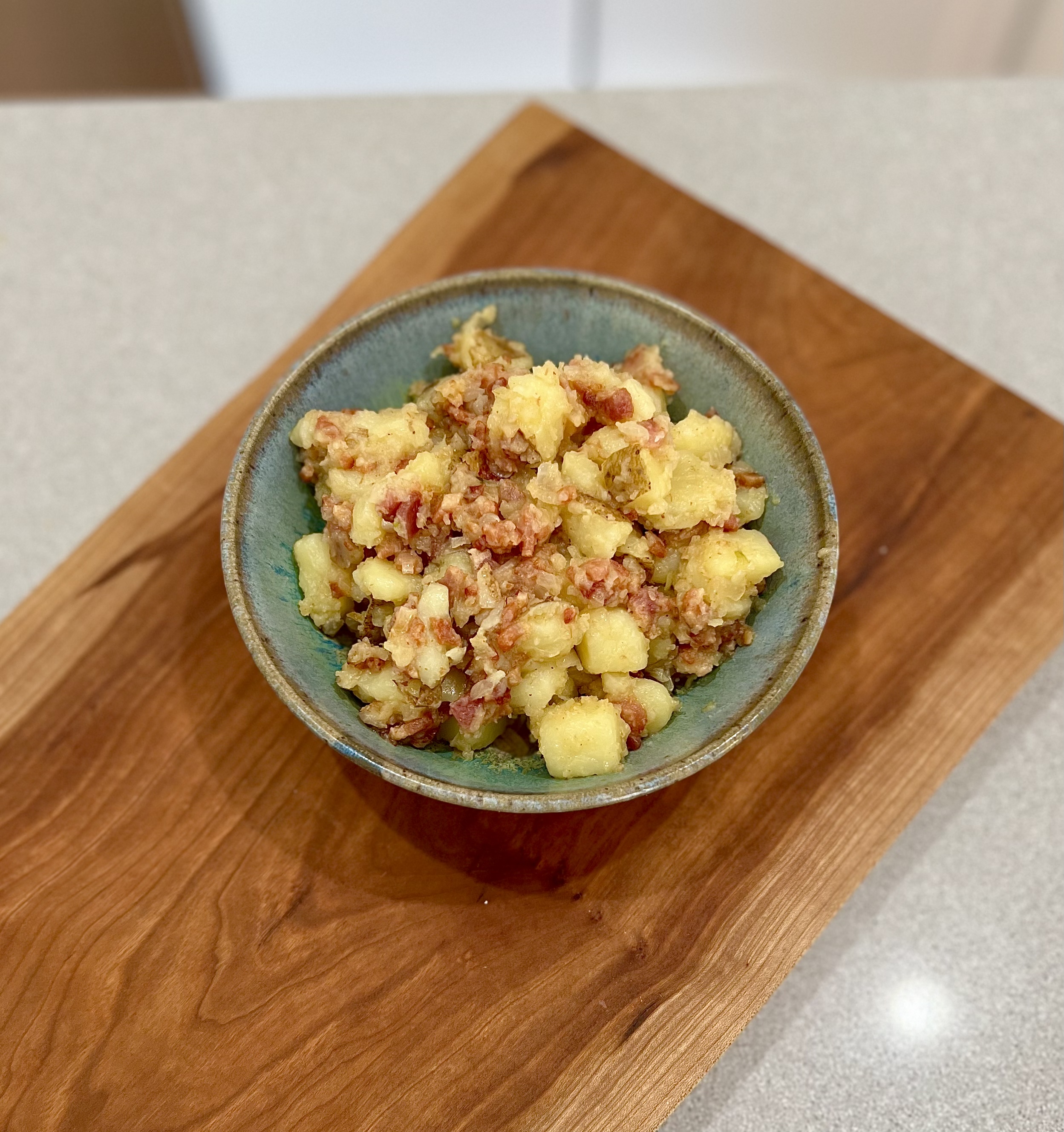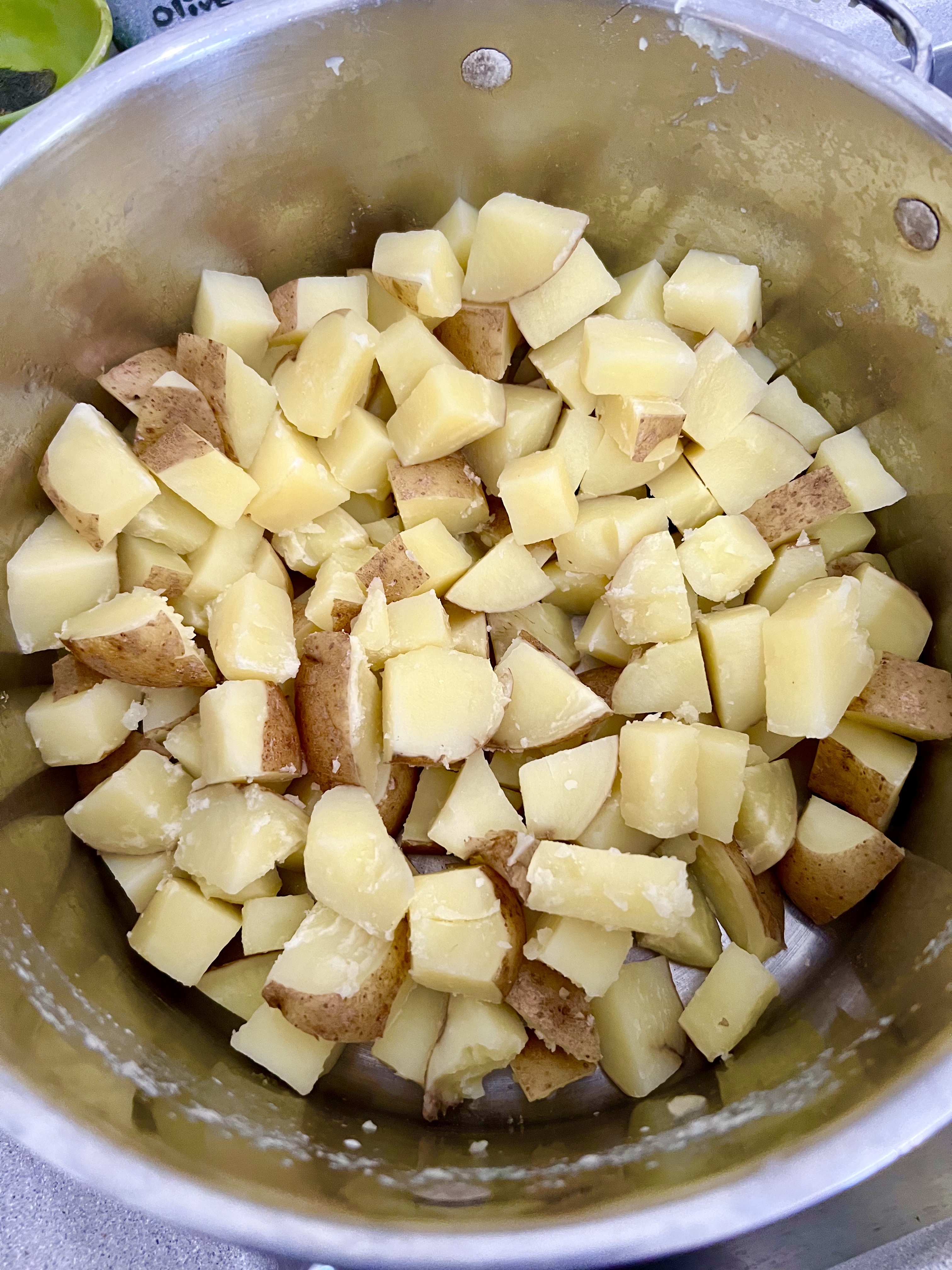 I like my potatoes with the skin on, so I remove any blemishes on the skins, then cut the potatoes in approximately 1/2” cubes. Some can be larger, some smaller, and they don’t have to be perfect squares. The smaller pieces will cook and soften faster, while the larger pieces will retain their shape and texture.