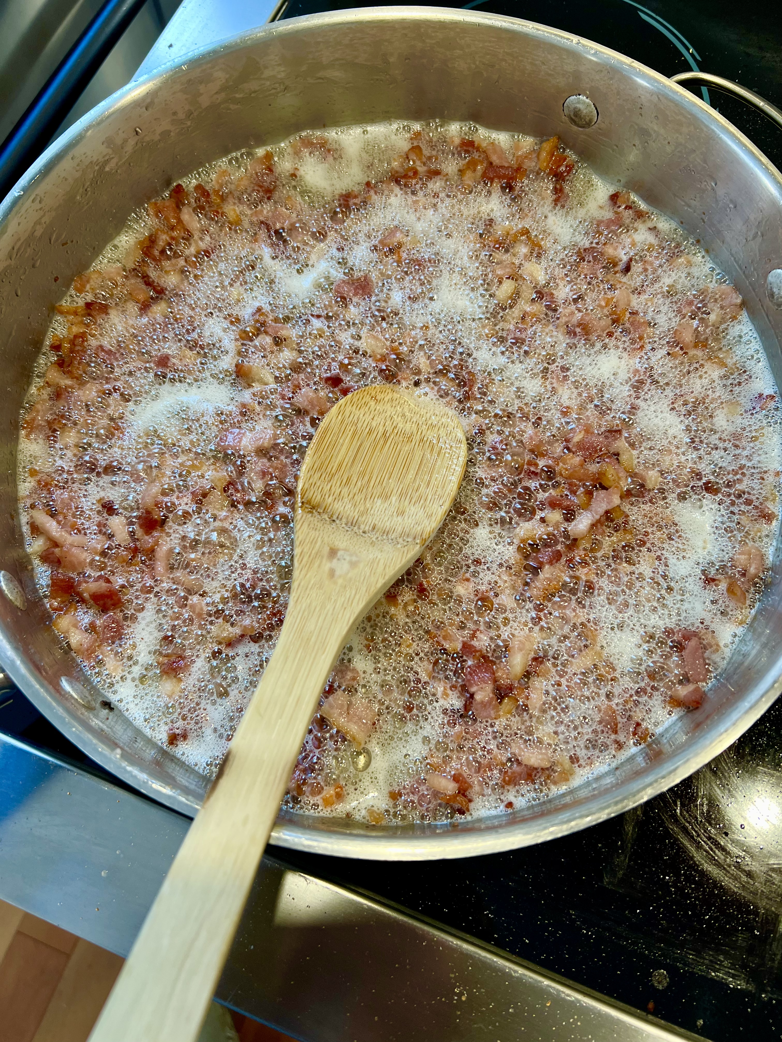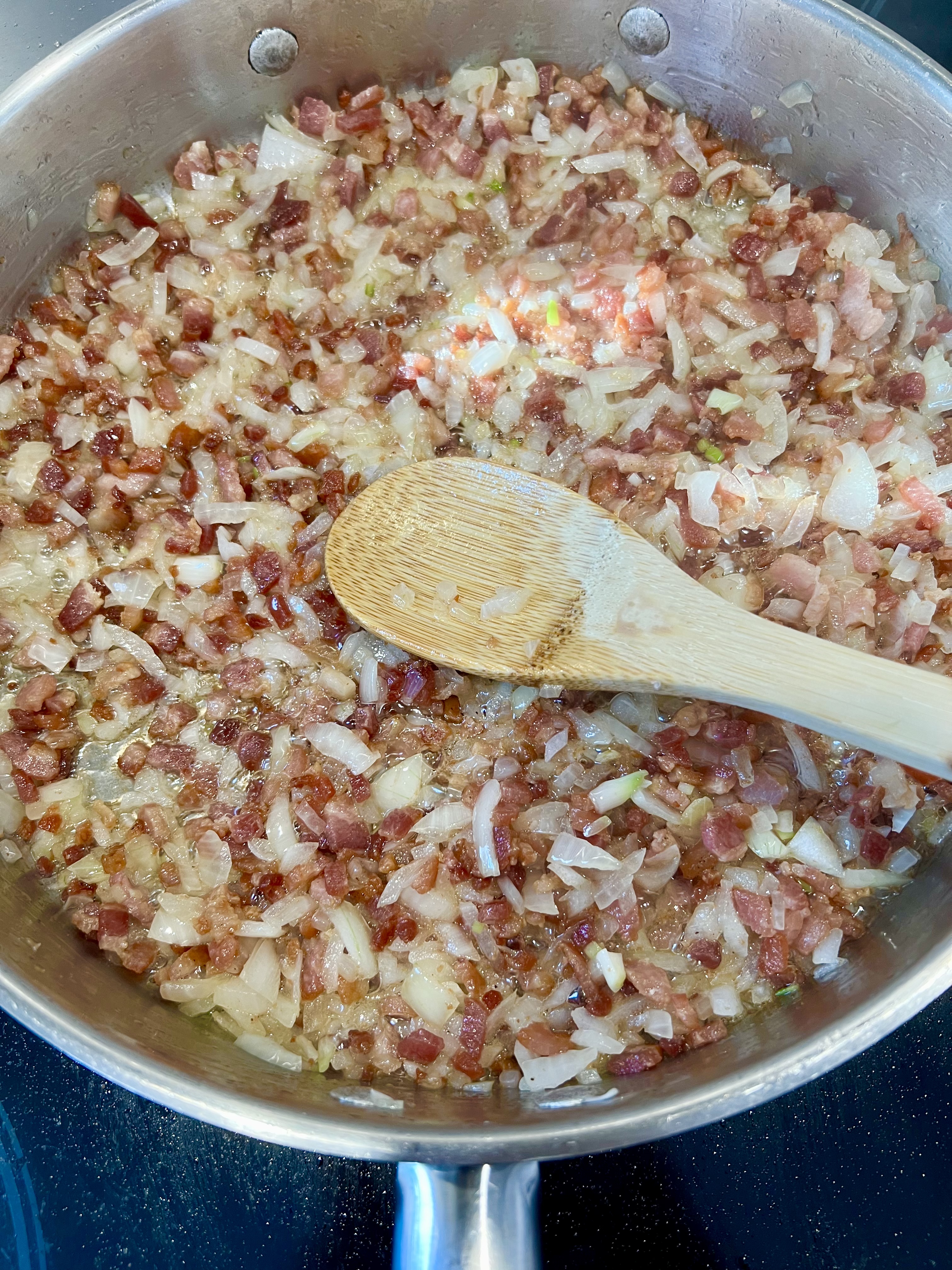 While the bacon is frying, finely chop the two onions. Add the onions to the pan when the bacon has cooked completely. Now, here’s where eyebrows are often raised: Leave all the bacon fat in the pan!