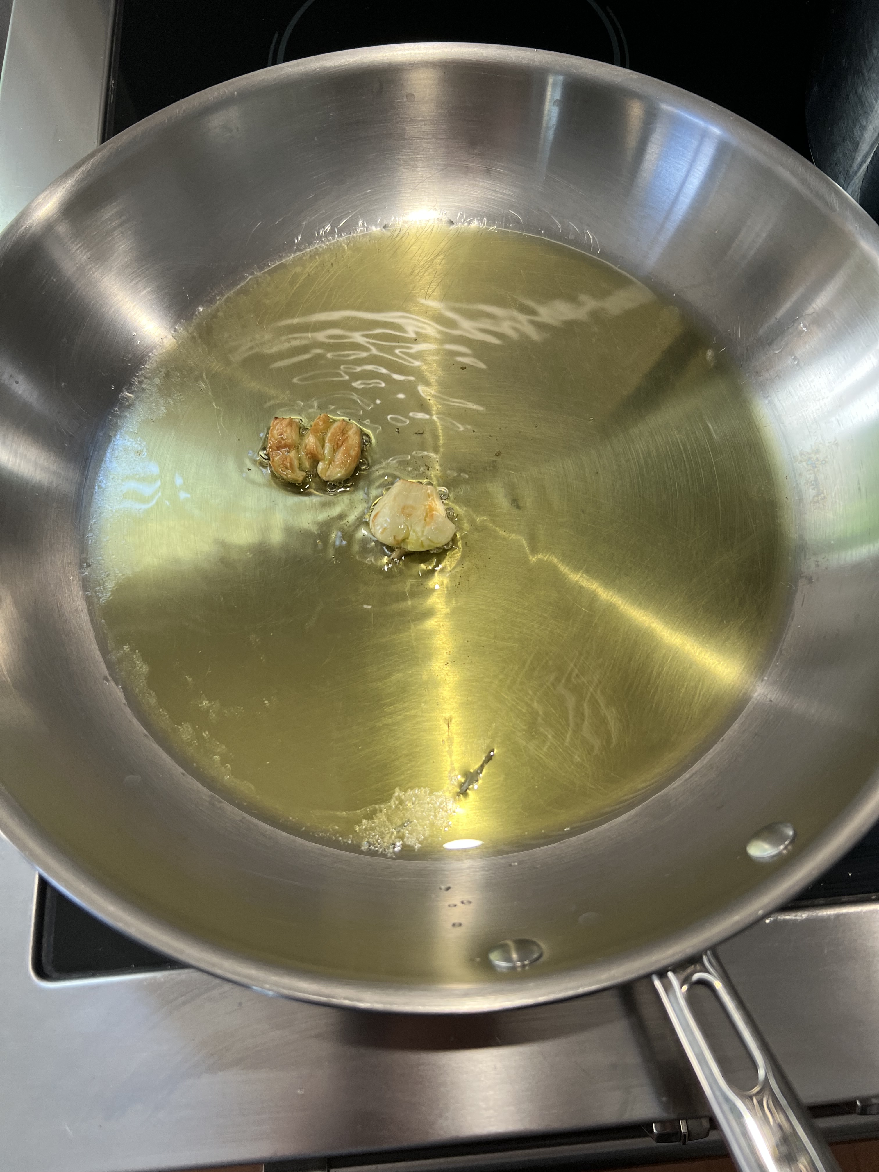 In a large skillet, combine the oil and garlic. Cook over medium heat, turning the garlic occasionally, until it’s deep brown on both sides, about 5 minutes. Remove the garlic from the skillet and discard it. (Or eat it!)