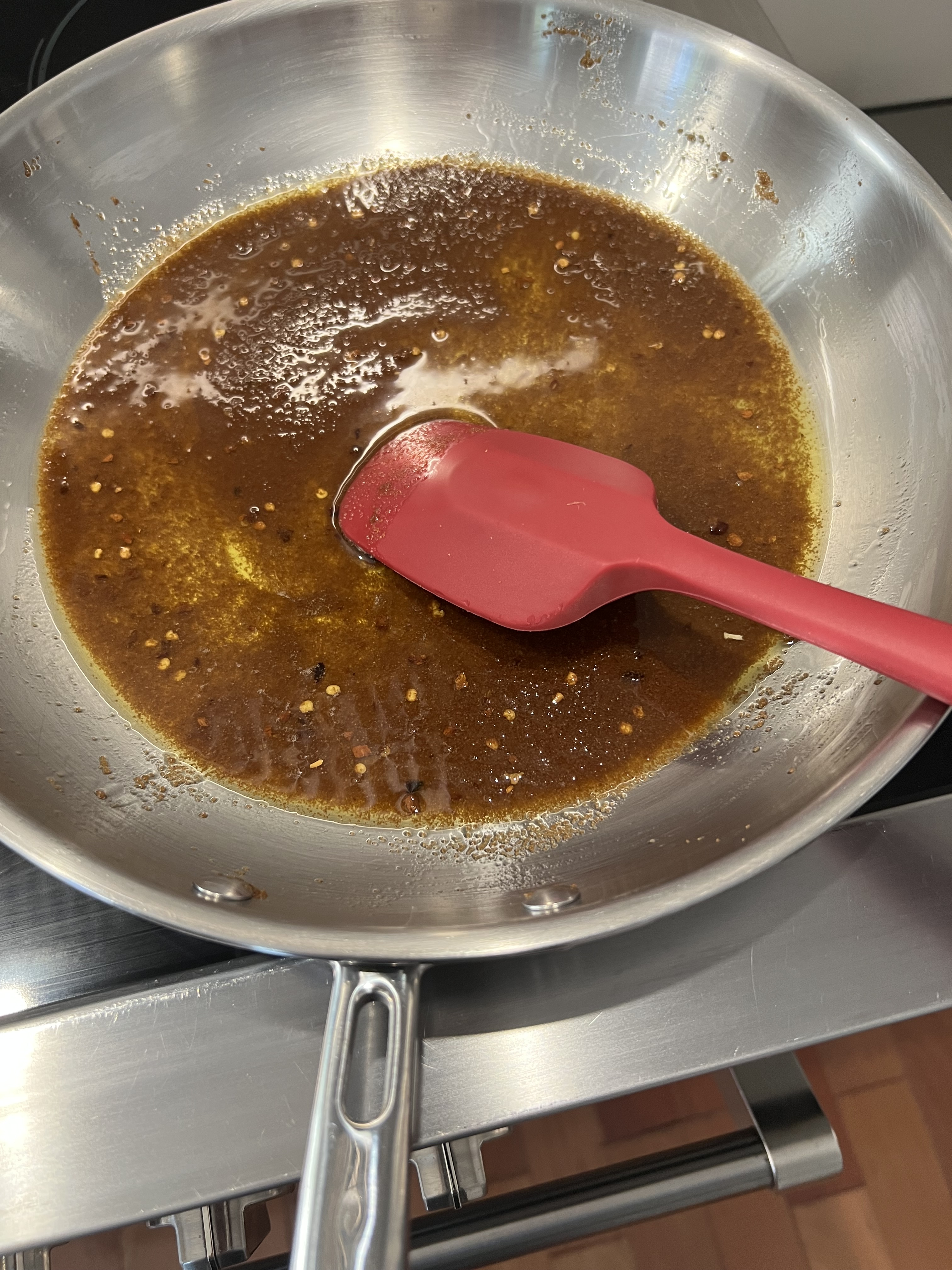 Add the red pepper flakes and continue to cook, stirring for about 30 seconds, until fragrant.