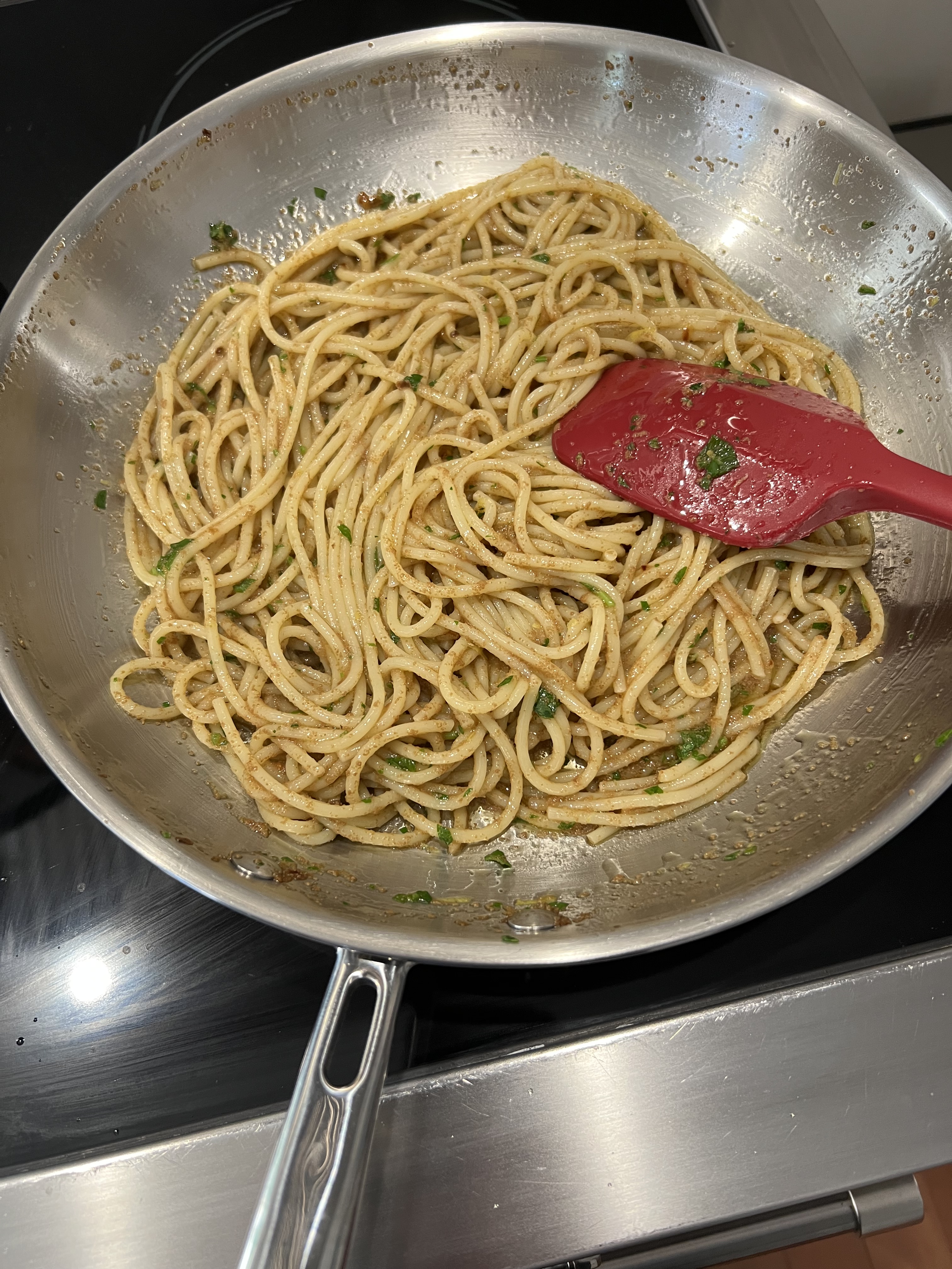 Rapidly stir the pasta in the skillet until it has mixed with the olive oil mixture and it has emulsified into a nice sauce. Add more pasta water if needed.