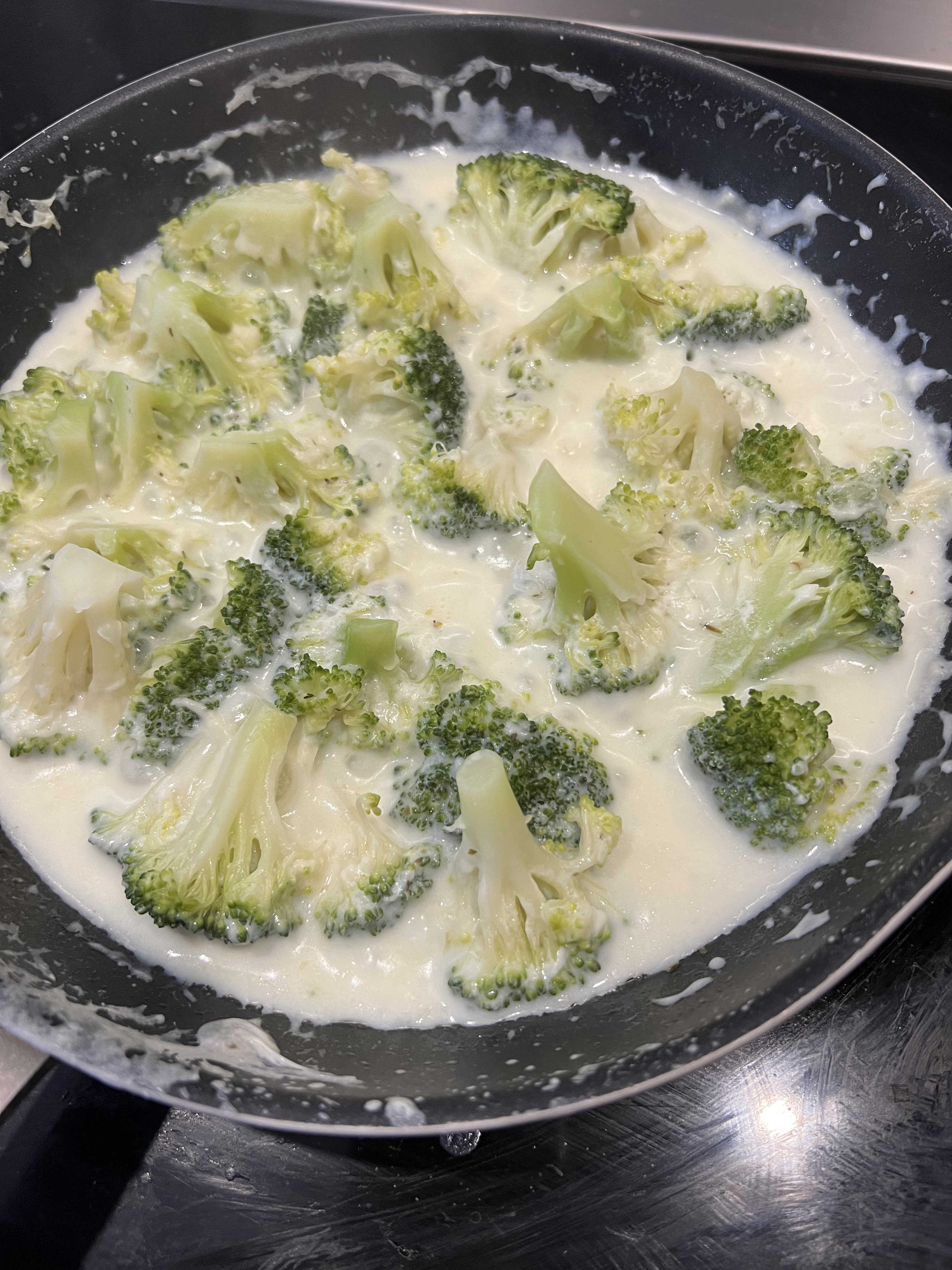 In a large pan, pour in the broccoli. (If you’re using frozen, you don’t have to thaw it.) Pour the béchamel sauce over the broccoli, and simmer it over medium heat, covered, for about 20 minutes, until the broccoli is soft and cooked through.