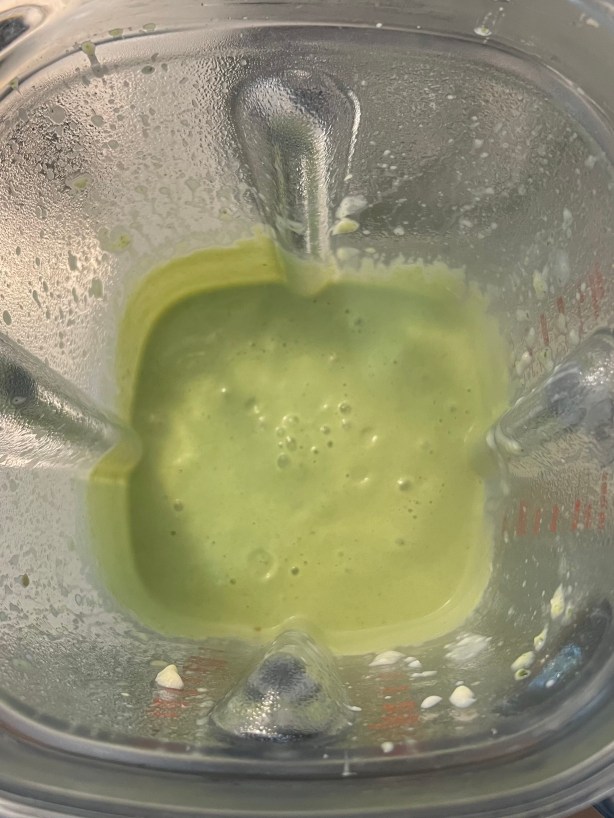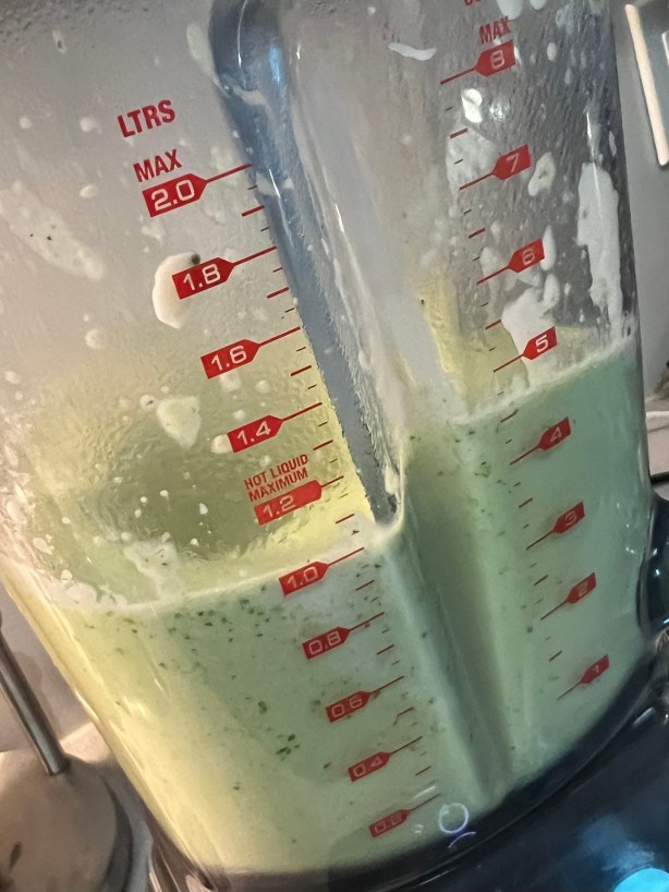 Everything in the pan goes into a blender. Season well with salt and pepper. Whiz it up until you have a broccoli sauce.
