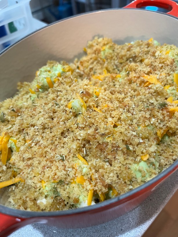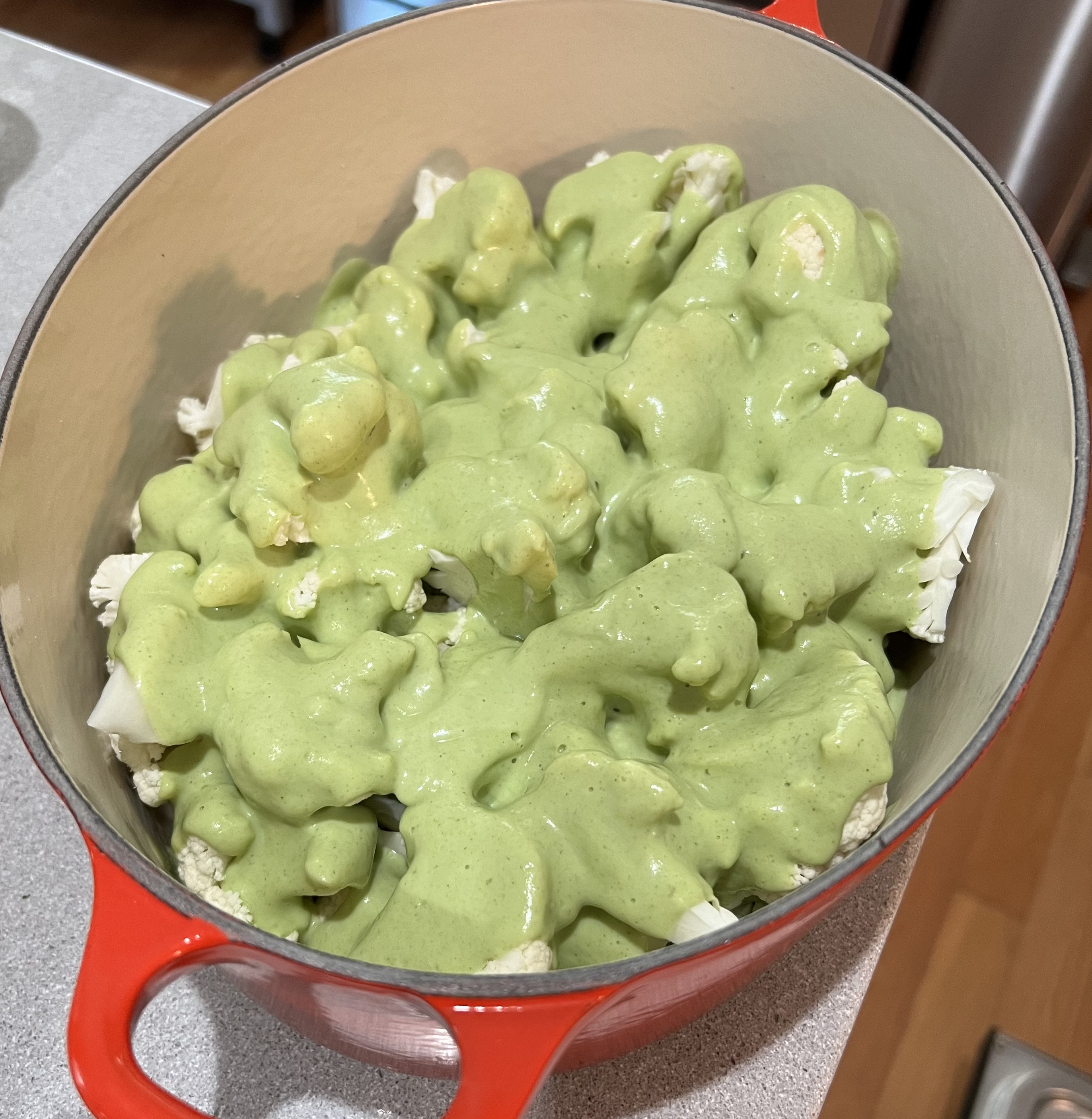 In a large ovenproof casserole dish, pour in the cauliflower. (Again, it can be frozen.) Pour the broccoli sauce on top.