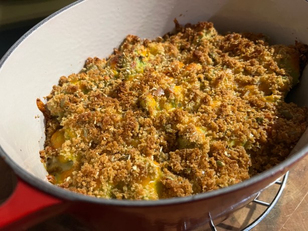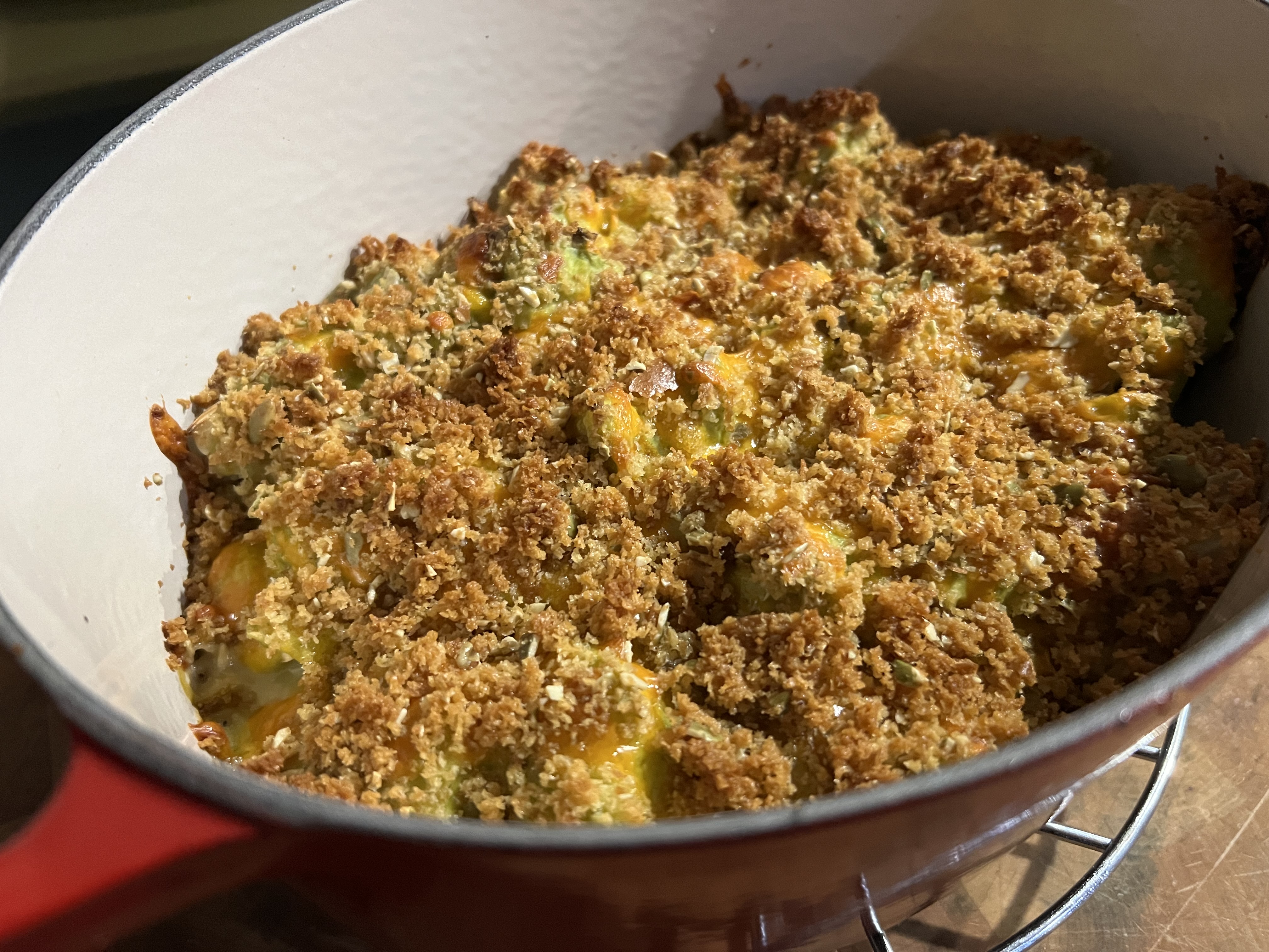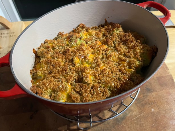 Sprinkle the bread crumb/almond mixture over the cheddar and bake for about 45 minutes until golden and cooked through.