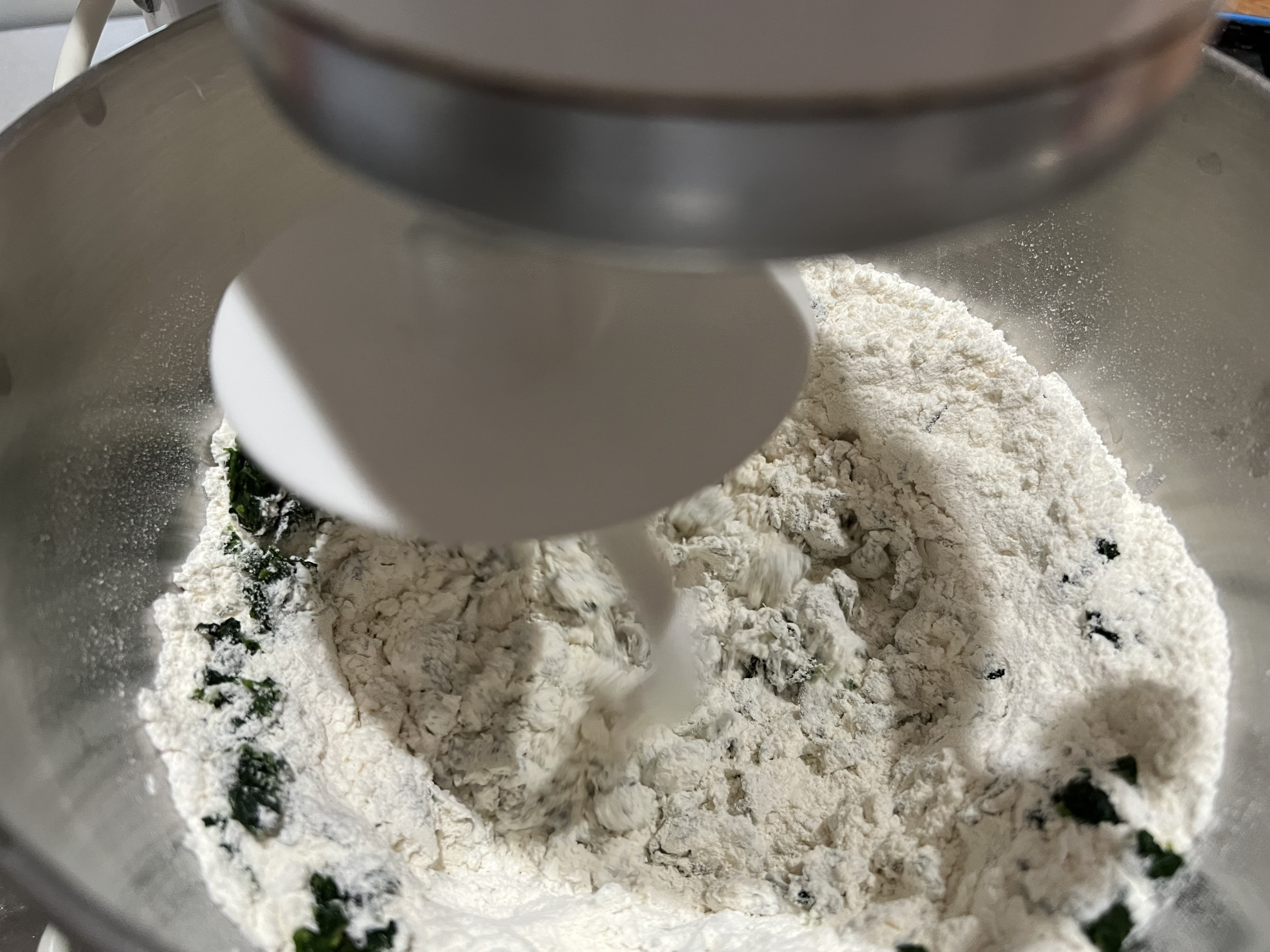 I’ve made spinach pasta before, so I figured it couldn’t be that hard to make spinach pizza dough. It’s pretty much the same procedure: I combined about 3 cups of 00 flour (I like King Arthur) with a tablespoon of Kosher salt in my standing mixer.