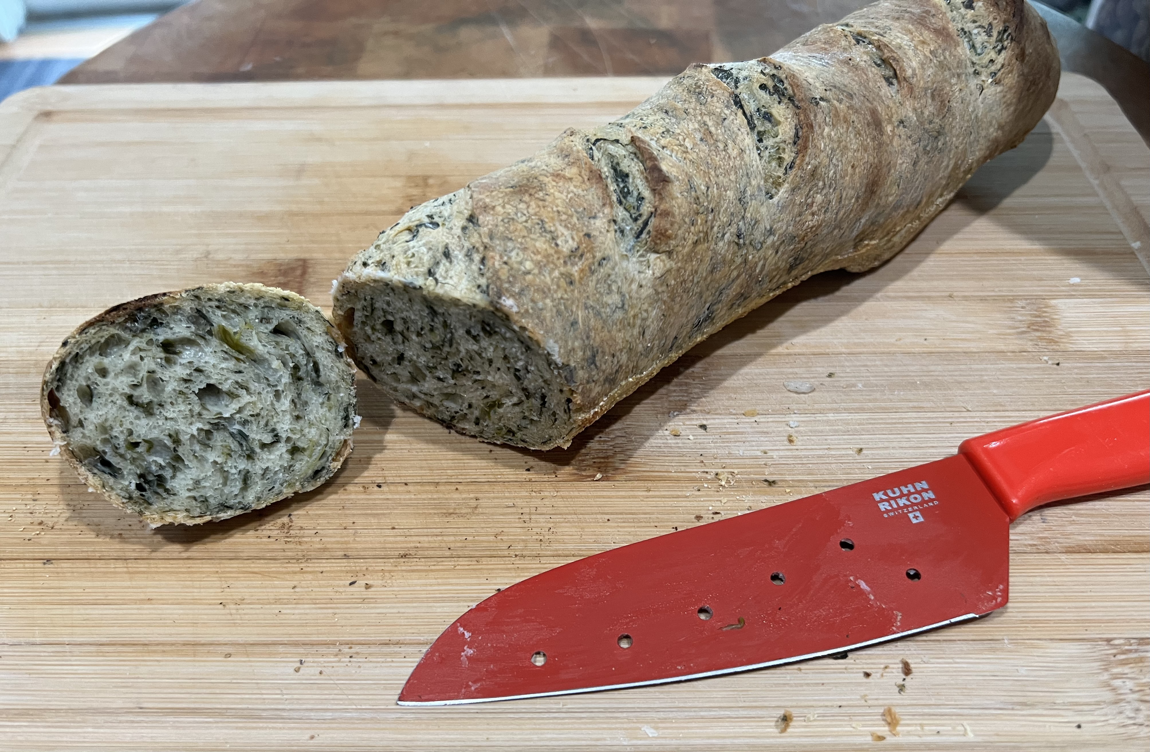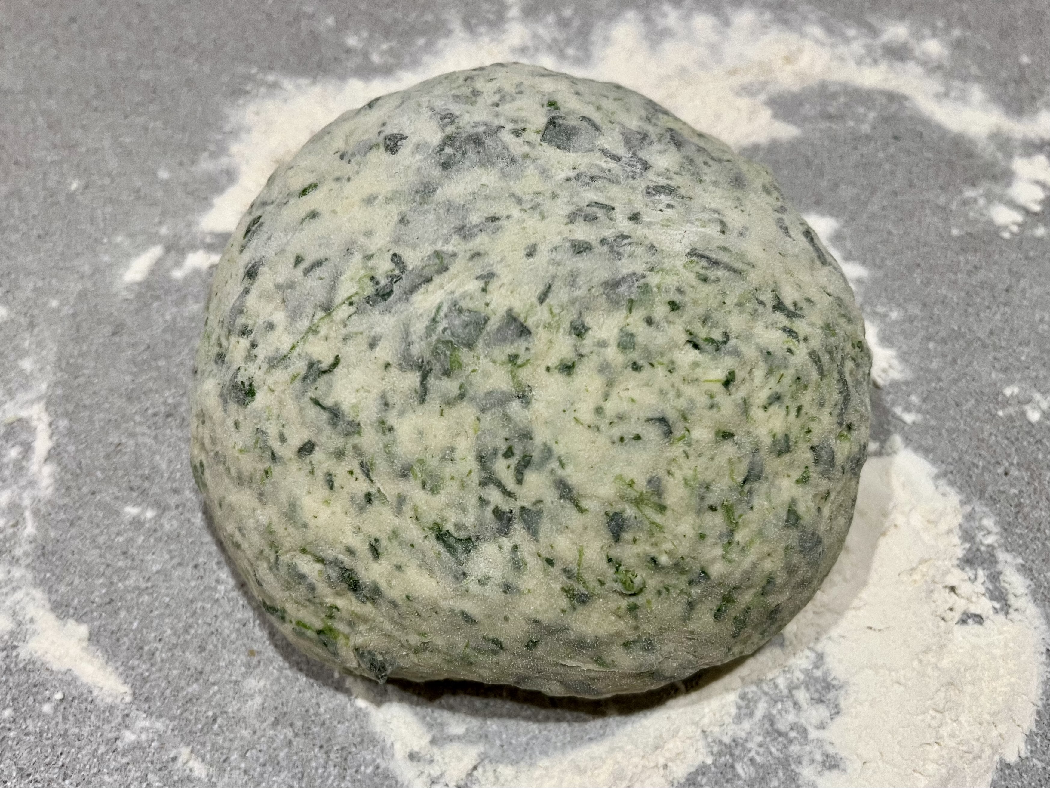 Meanwhile, I thawed a package of frozen spinach and removed 6 ounces’ worth. I squeezed as much water out of it as I could, reducing the weight to about 4 ounces. I chopped the spinach up well, then mixed it with the flour in the mixing bowl. I added the water with the yeast, adding some of the spinach water if more water was needed.