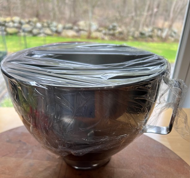 I added a little olive oil to the mixing bowl, and placed the dough ball back in it, covering it with plastic to rise over several hours.