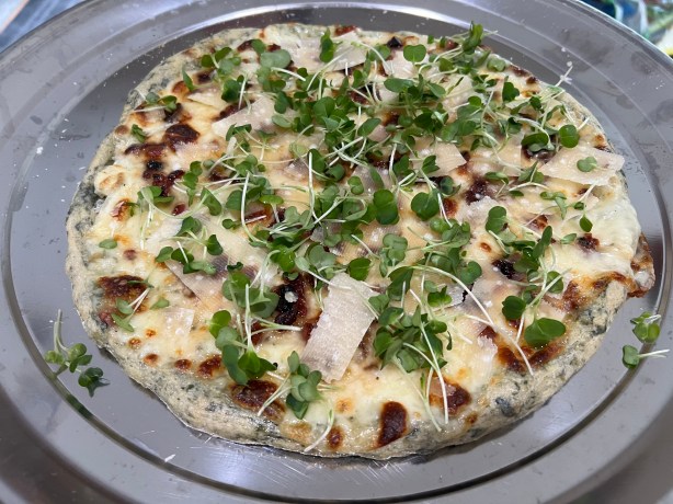 I stretched the spinach dough out on the pizza peel, and spread the bechamel sauce on it. I followed this with slices of mozzarella, and bits of home-cured guanciale that I had chopped and fried in a pan. In the oven it went, and once it came out, I added shaved Parmigiano Reggiano and some microgreens.