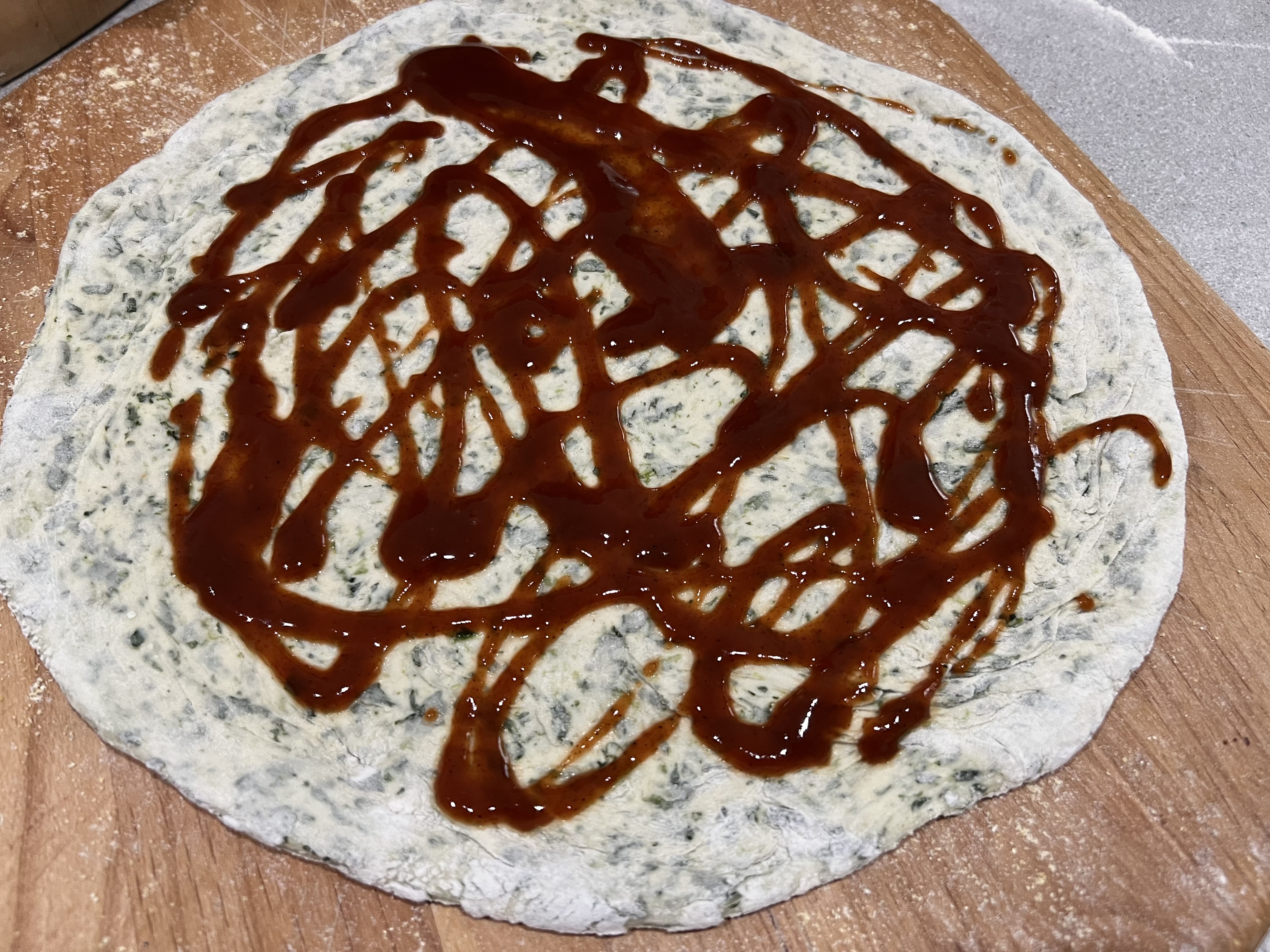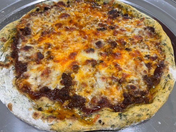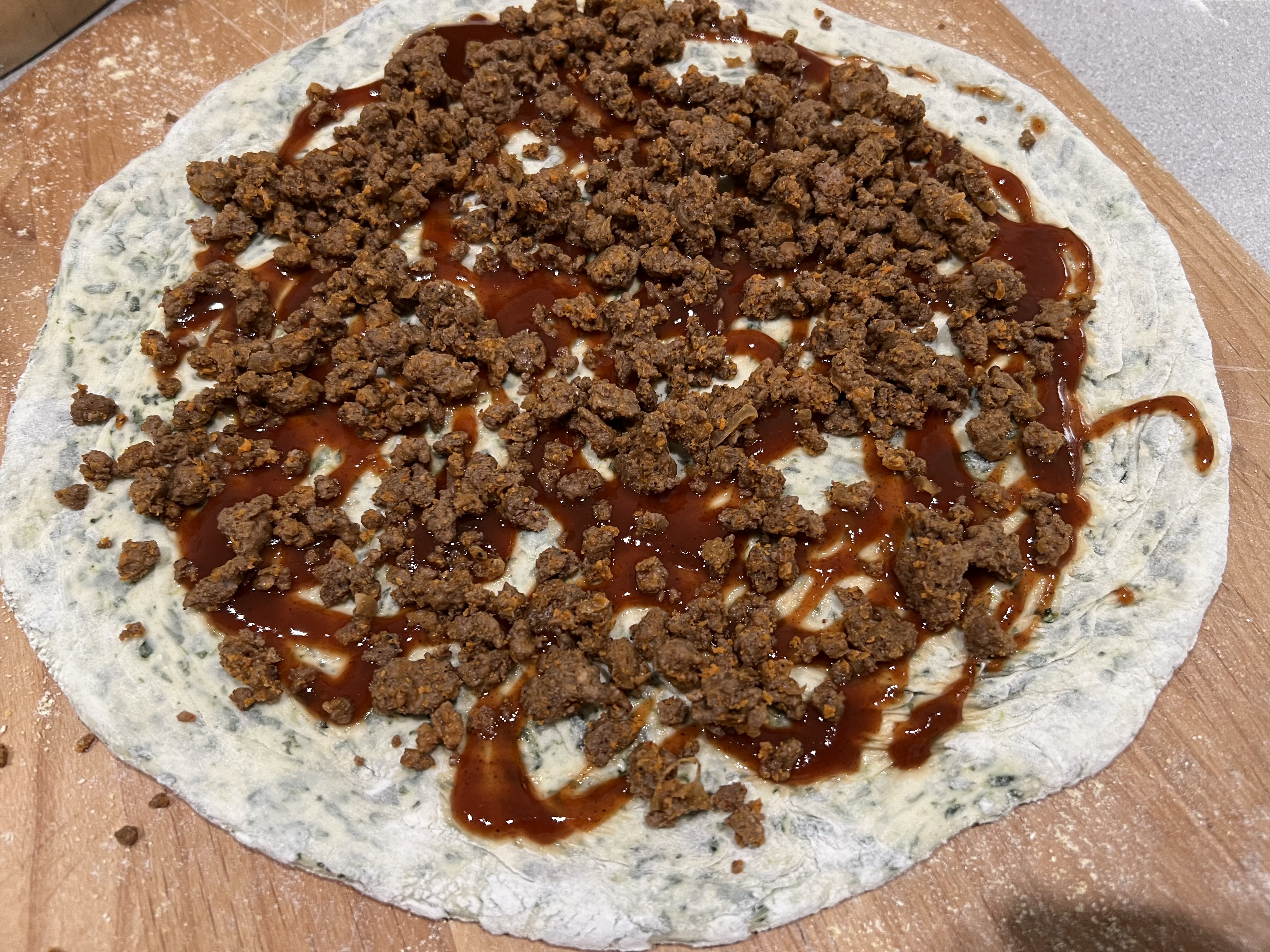 Pizza #2 utilized leftovers from previous dinners. I spread the spinach dough out on the pizza peel, and spread some barbecue sauce on it. I followed this with leftover chili meat I had made for chili dogs a couple of nights before. Then I topped the meat with a combination of mozzarella and cheddar.