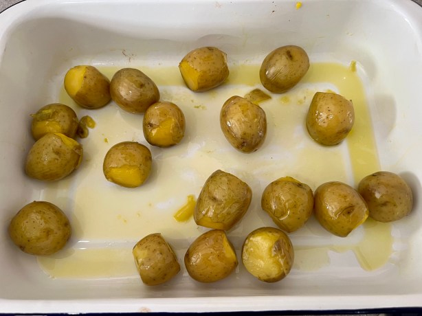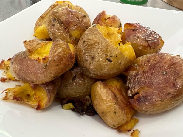 Simple and delicious, this recipe is inspired by Jamie Oliver, who uses peeled white potatoes. I prefer whole, small, Yukon golds or yellow potatoes, my personal favorites, with the skin on. I think the skin adds an extra level of wonderful crunch.